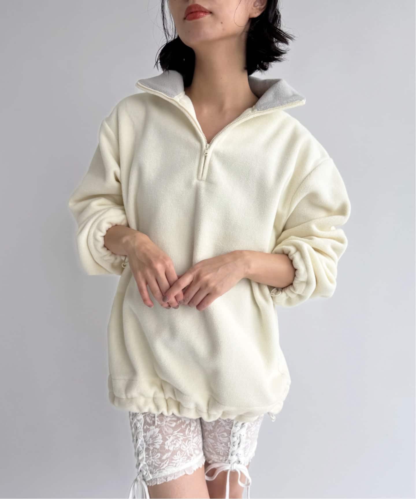 上だけ絞ると裾がヒラヒラしてフリースなのにフェミニンに着れるディテールに。