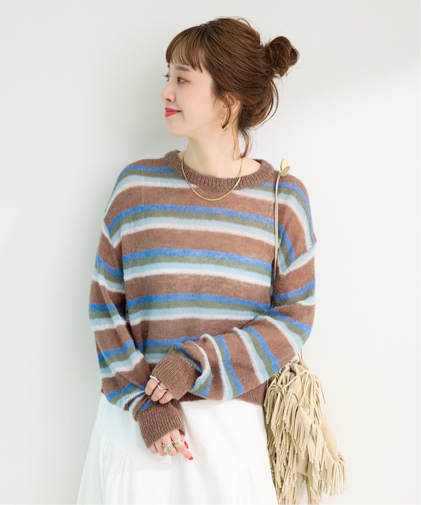 トレンドのマルチボーダーをモヘヤ&ウール混のニットで表現したエアリータッチなニットプルオーバー。
