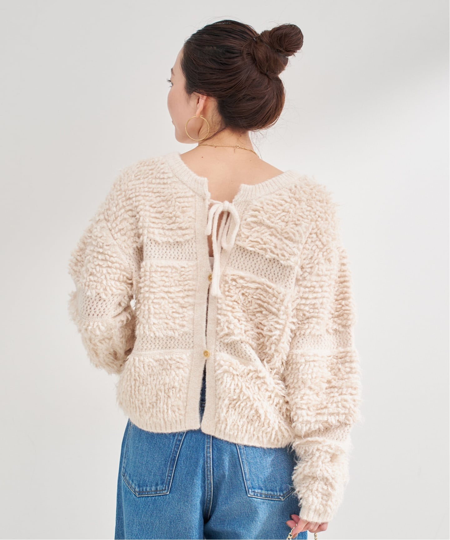 ループとメッシュの編地を交互にし、ボーダー柄を表現したカーディガンで、前後2WAYでも着用可能。