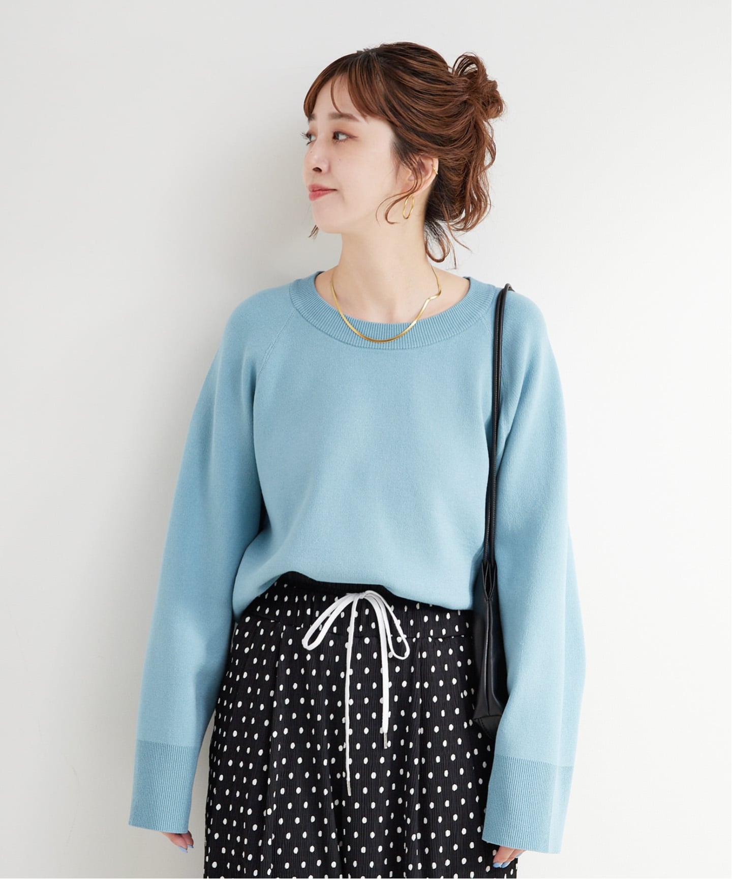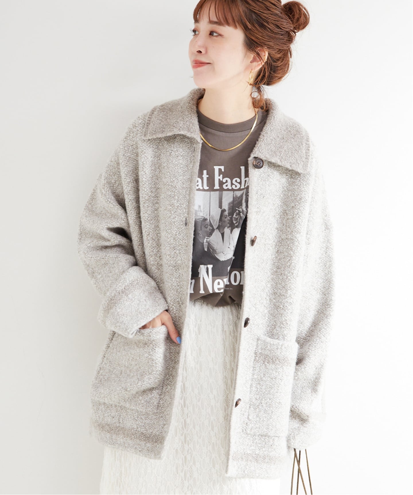 抜け感のあるゆったりとしたシルエットに、短めの着丈と少し広めの袖口が今年らしい一枚。