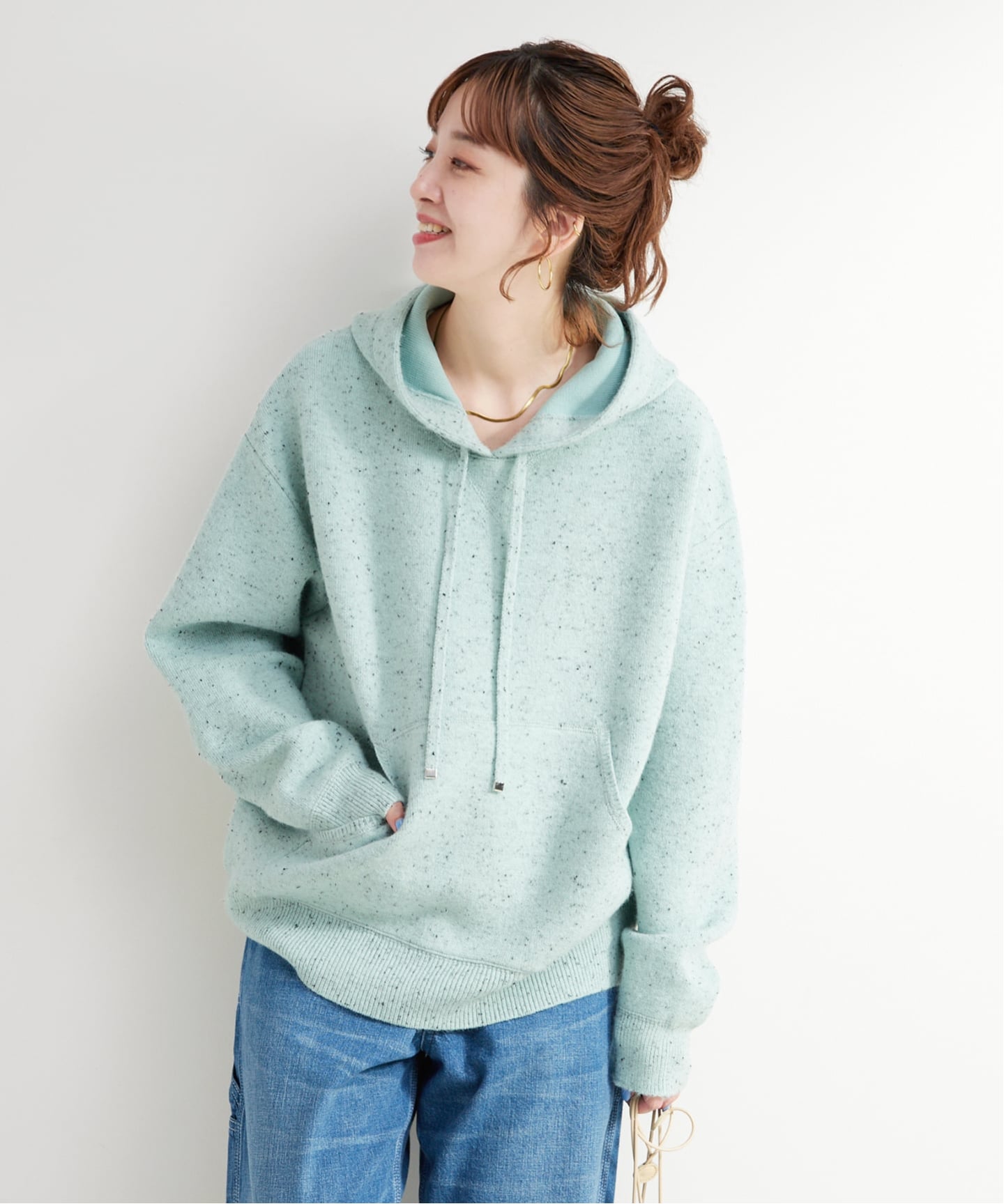 意外と首元が汚れやすいニットパーカーですが、手洗い可能でイージーケアなアイテム。