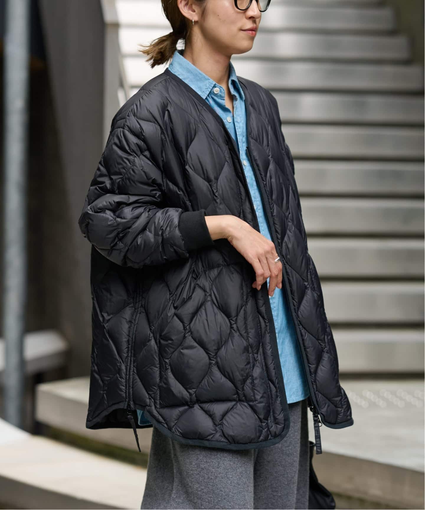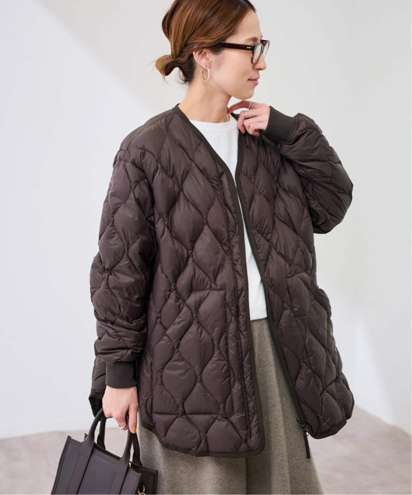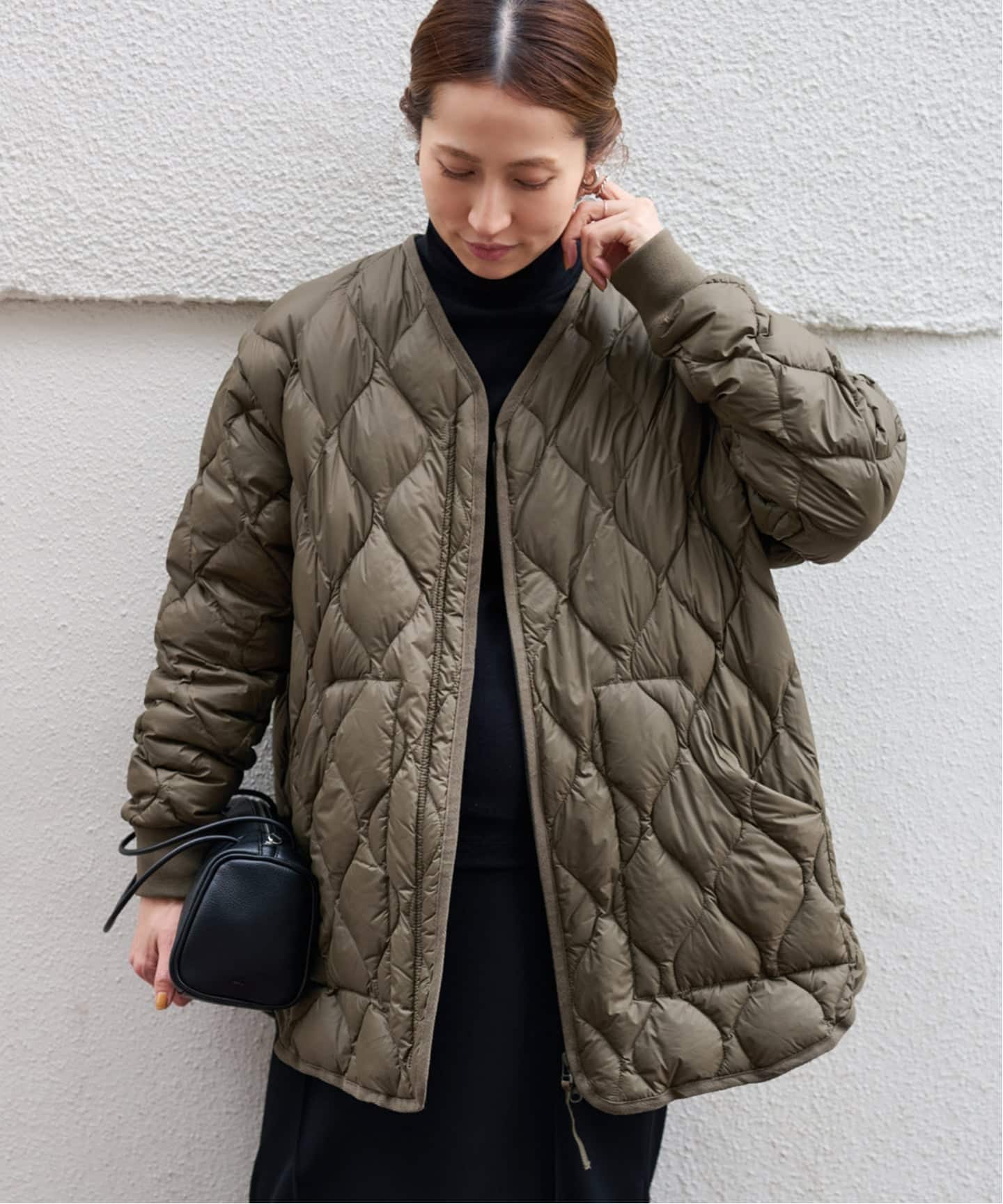ノーカラーのミリタリーキルトブルゾンに、フードビブスをセットした機能的なアウター。