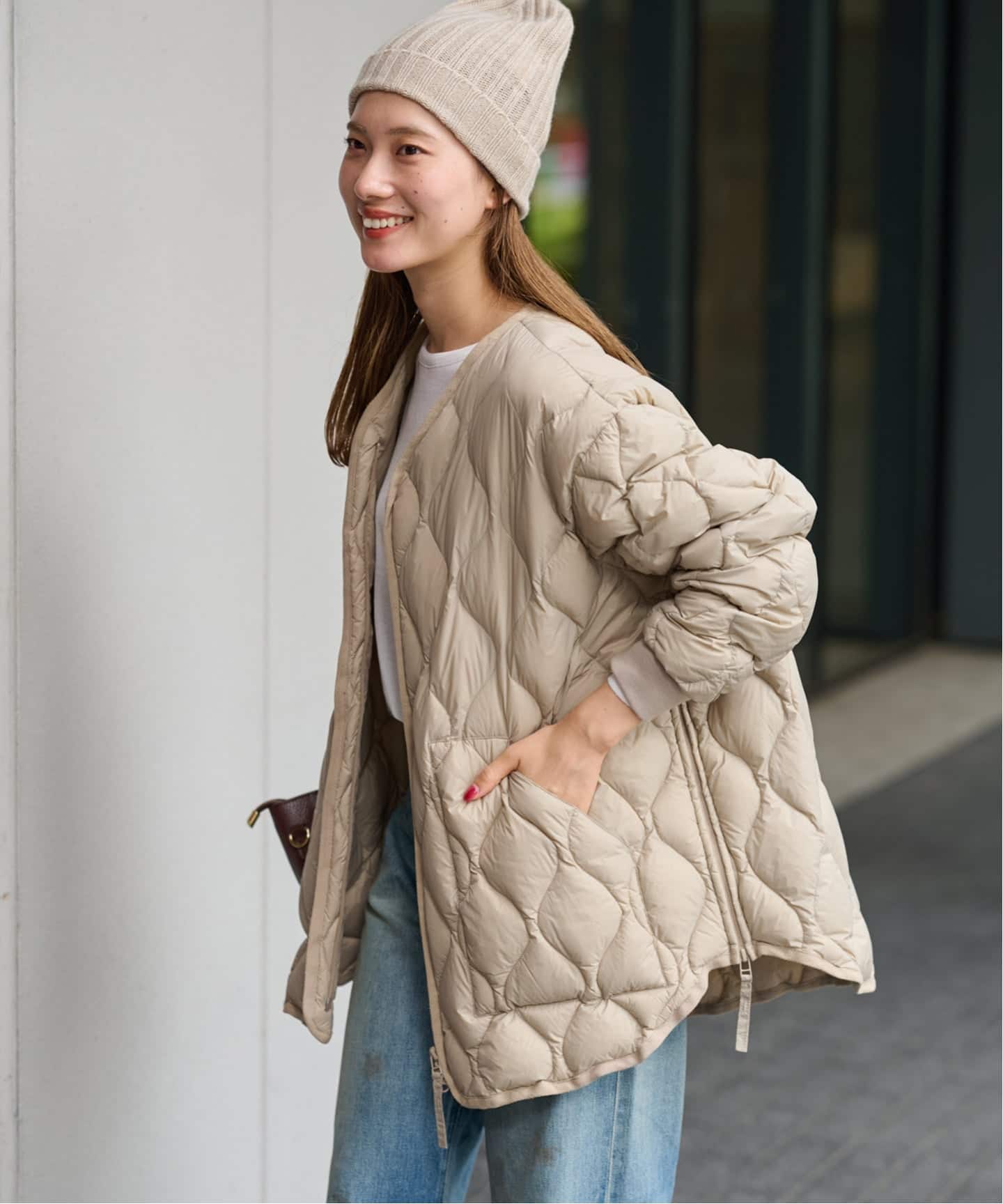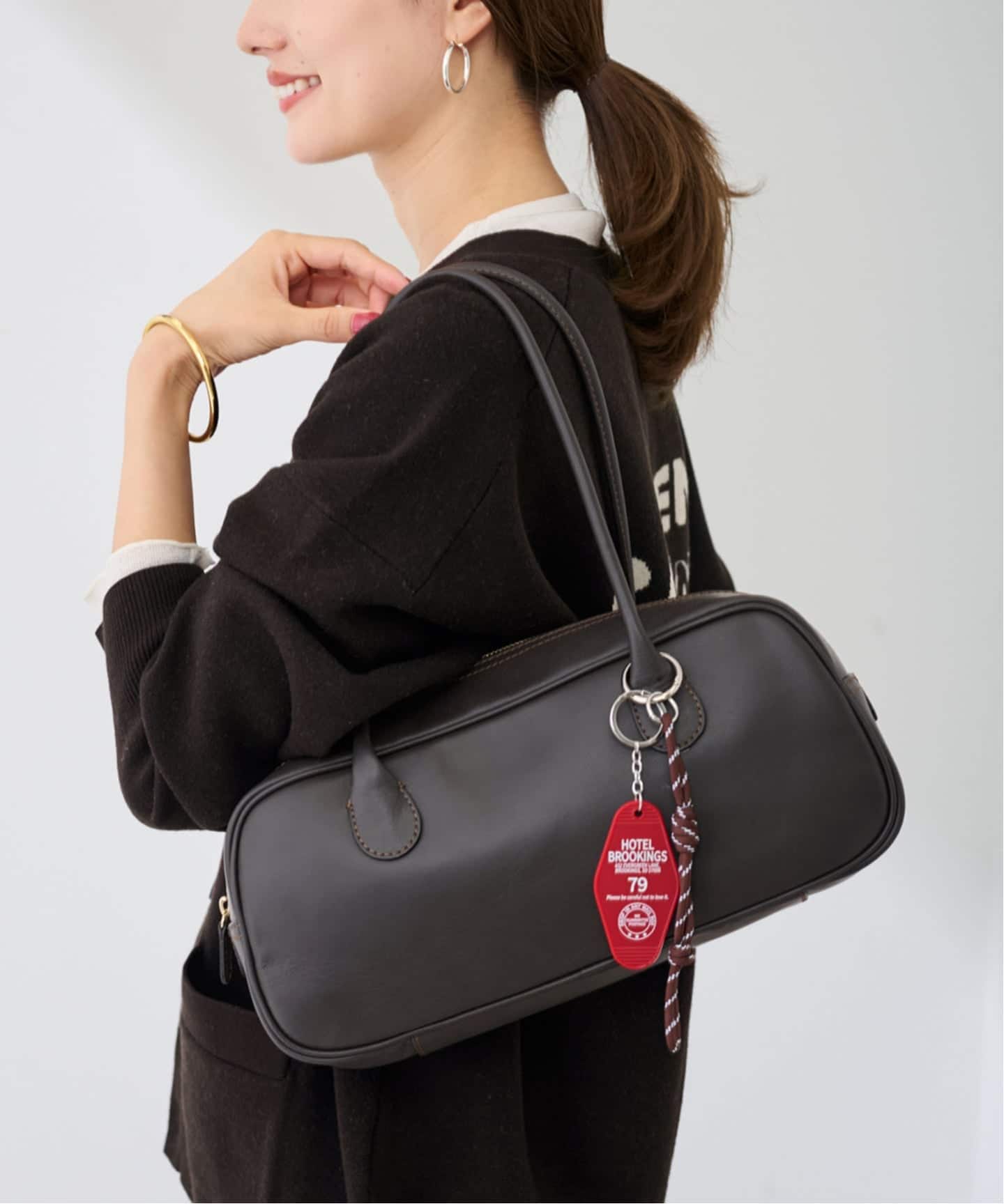 トレンドの横長シルエットに長めのハンドルで、アウターを着ていても持ちやすいデザイン。