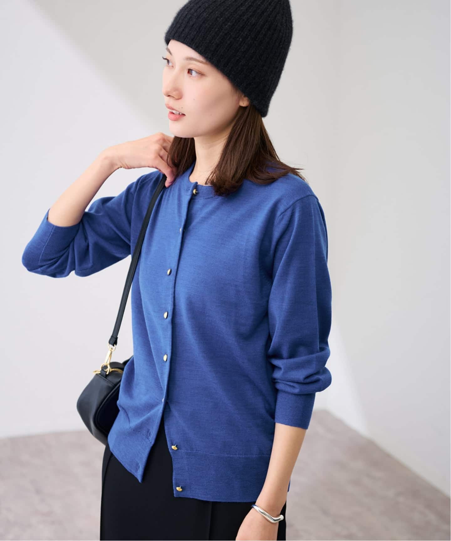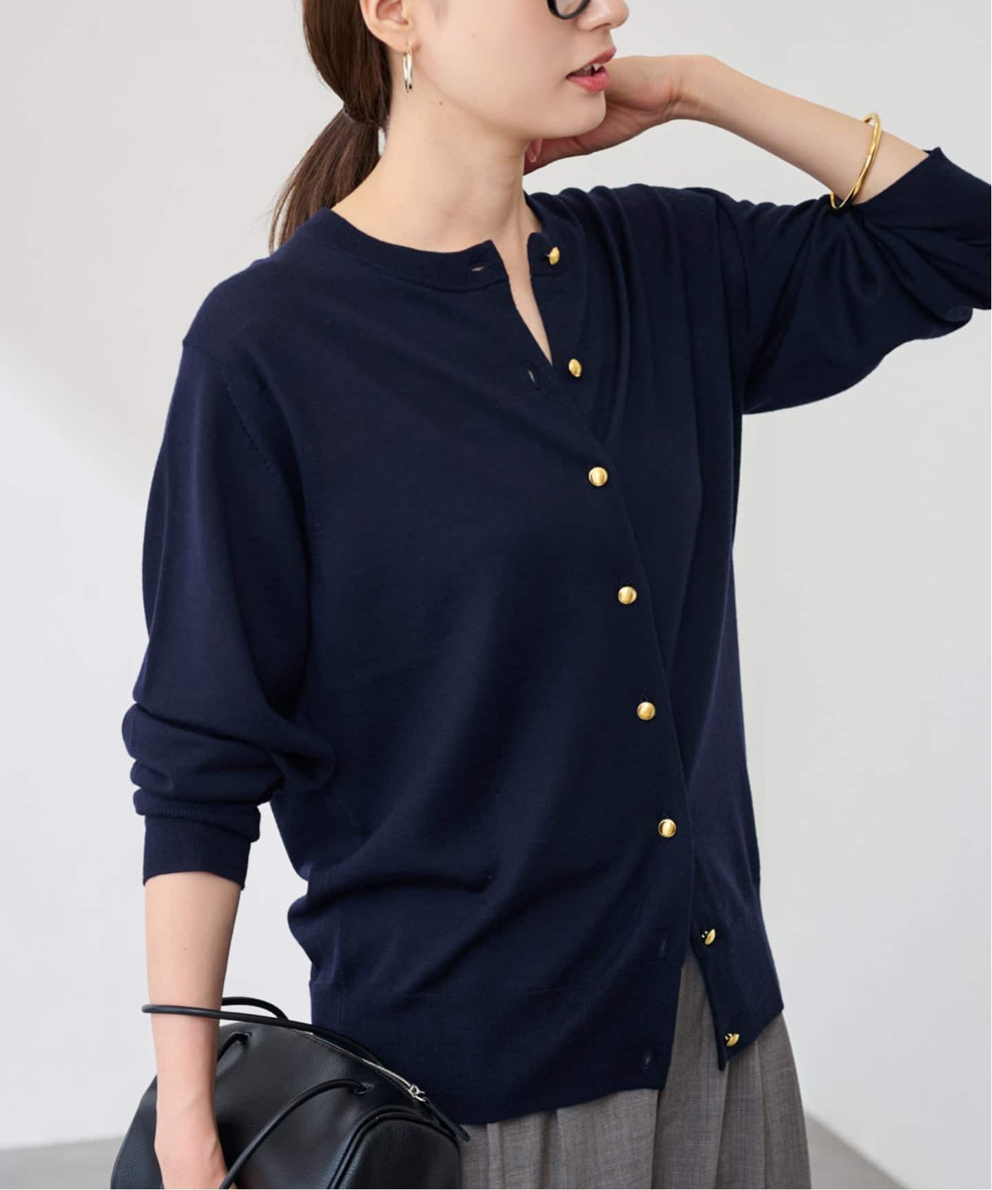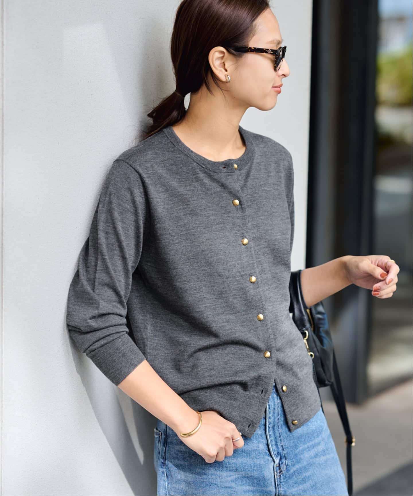 メタル釦がアクセントになるクルーネックカーディガン。
