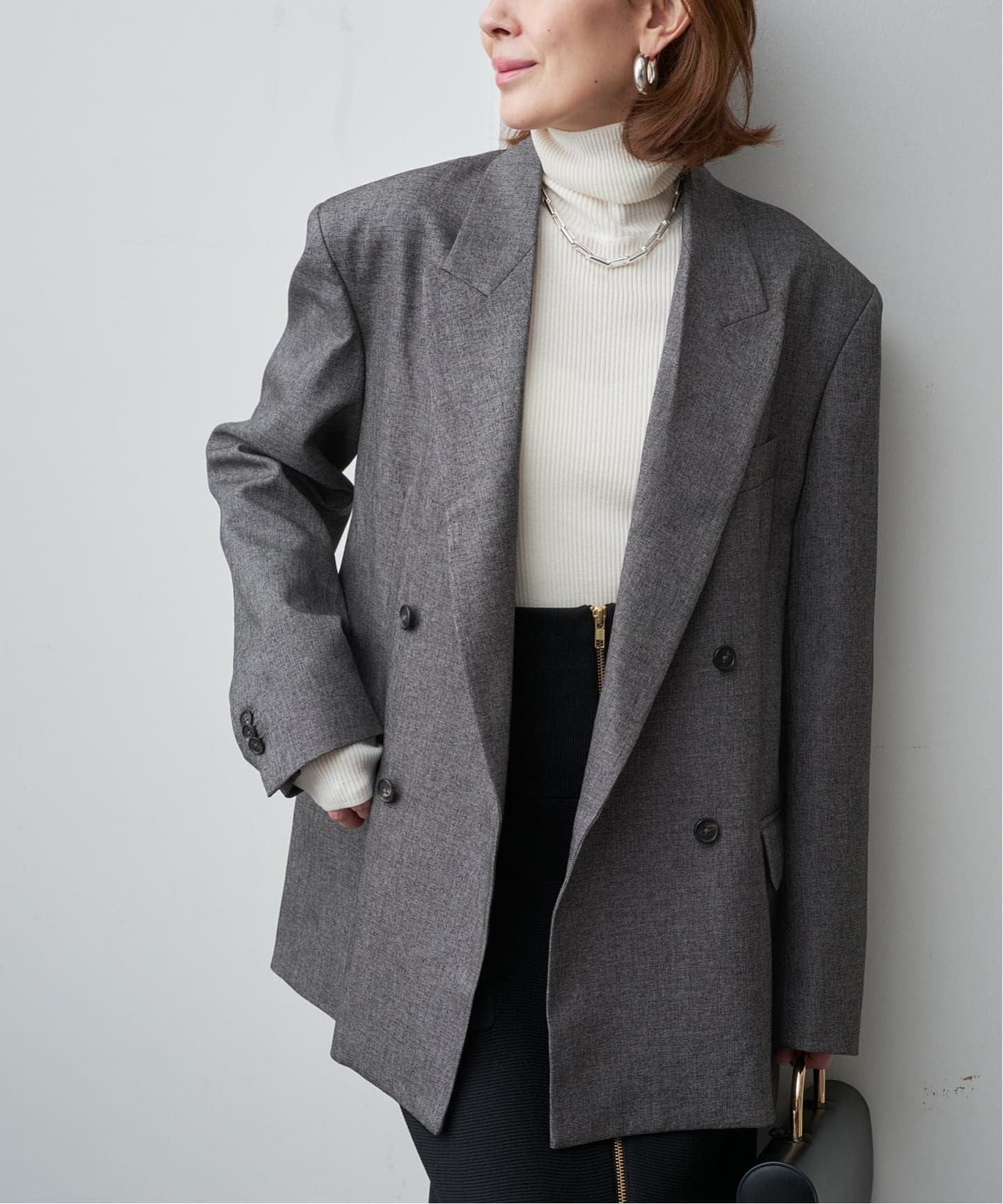 シアーブラウスとのレイヤードとオーバーなジャケットを羽織り、モードでキリっとした辛口のスタイリングに。