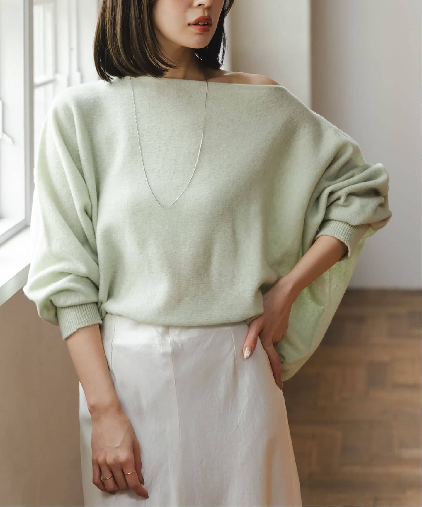 内袖がオープン仕様になっているので、そこから袖を通すとケープシルエットが叶うという新鮮なニット!シャツとのレイヤードでこなれた着こなしも◎