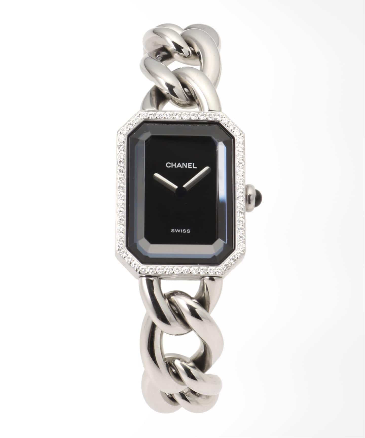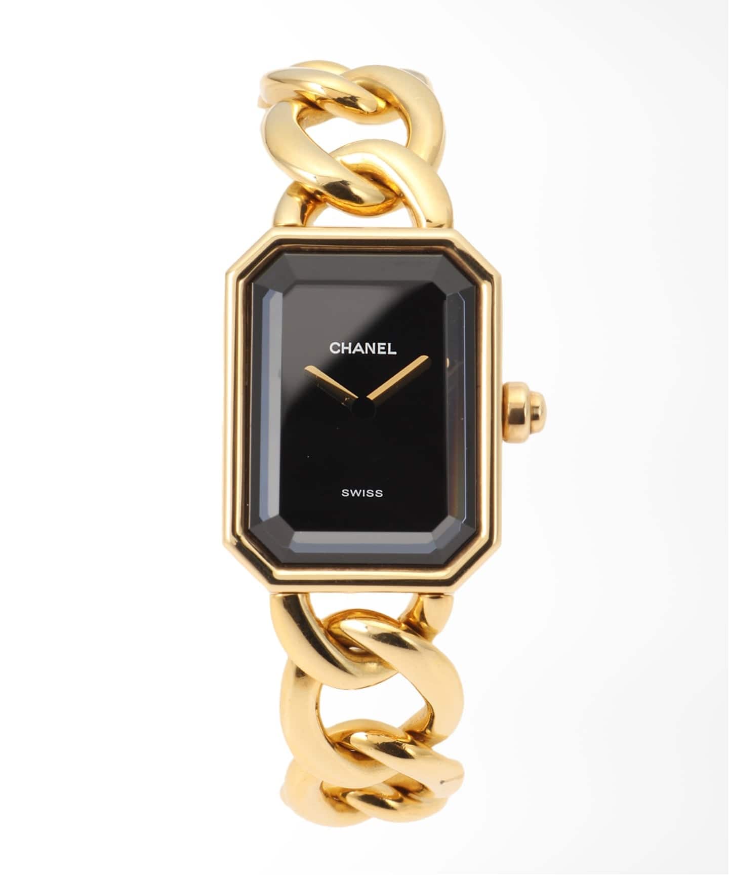 No5のボトルがケースデザインのルーツ。ブレスレット部分には、伝統的なチェーンのディテールが落とし込まれています。こちらは80年代後半から90年代ごろにかけてのヴィンテージプルミエール。年々人気が高まりつつあるシャネルのタイムピース。