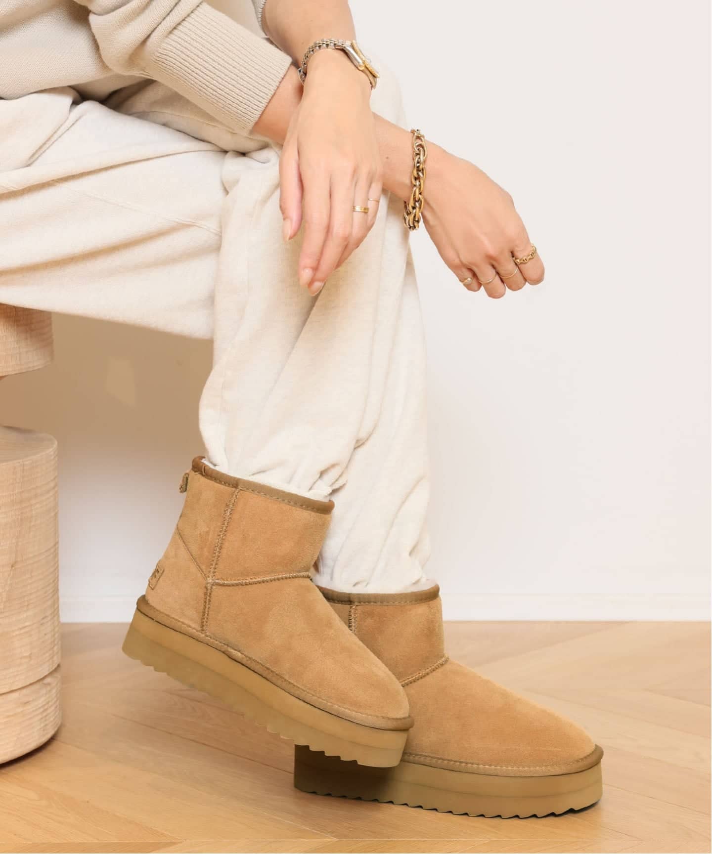 UTZONのムートンコート。軽やかな着心地と上質な質感が魅力の一着です。今回のテディムートンは、特別にゴールドのダブルジップ仕様に。ベージュのムートンと一体感のある艶めきが、上品に映えます。リバーシブル仕様で、気分やスタイリングに合わせた着こなしも楽しめます。