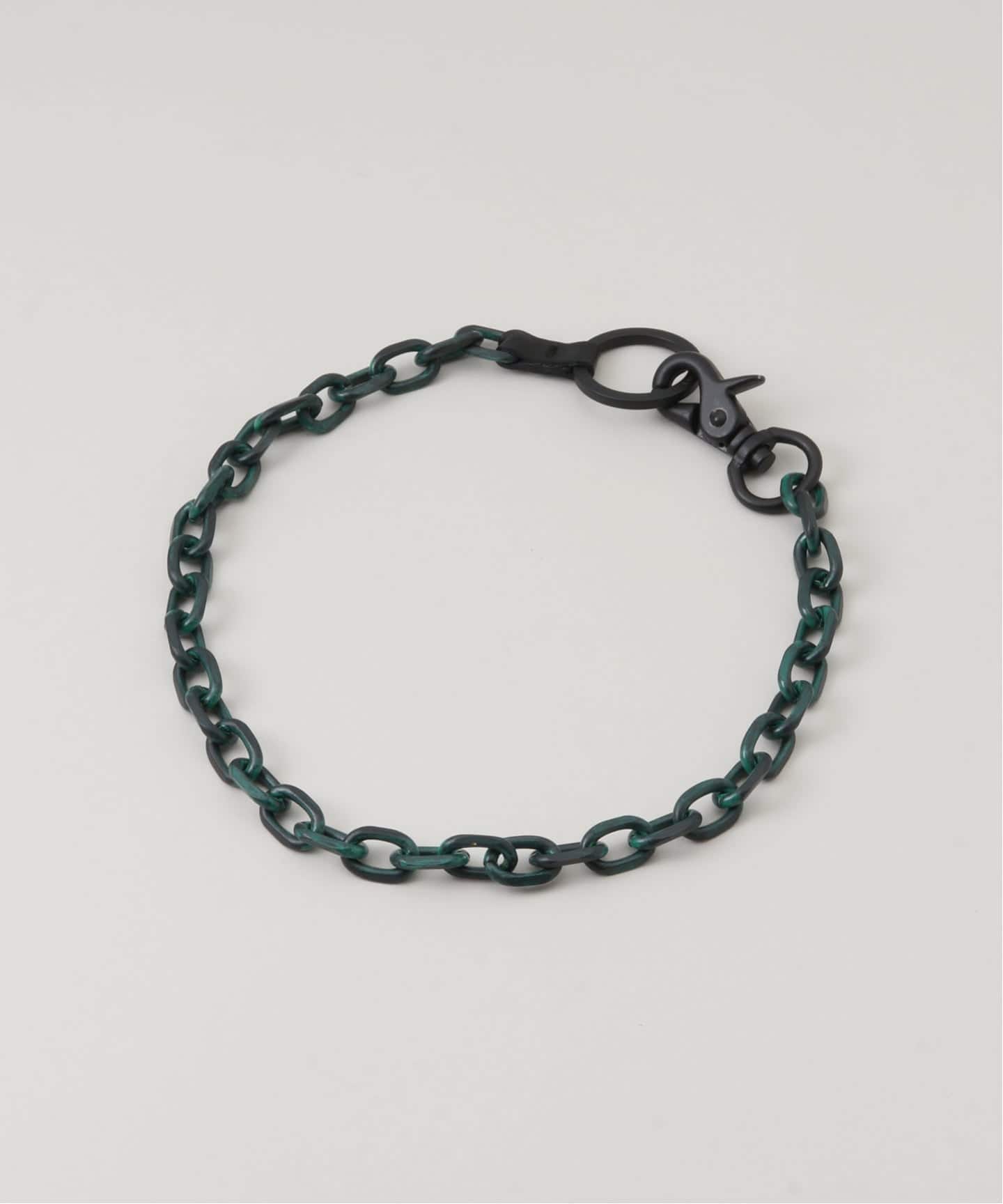 ポルトガルで手作りされたこのキーチェーンは、オキシダイズドグリーン仕上げの真鍮チェーン、日本製のトリム、そしてOUR LEGACYのロゴが刻印されたWリングが特徴です。