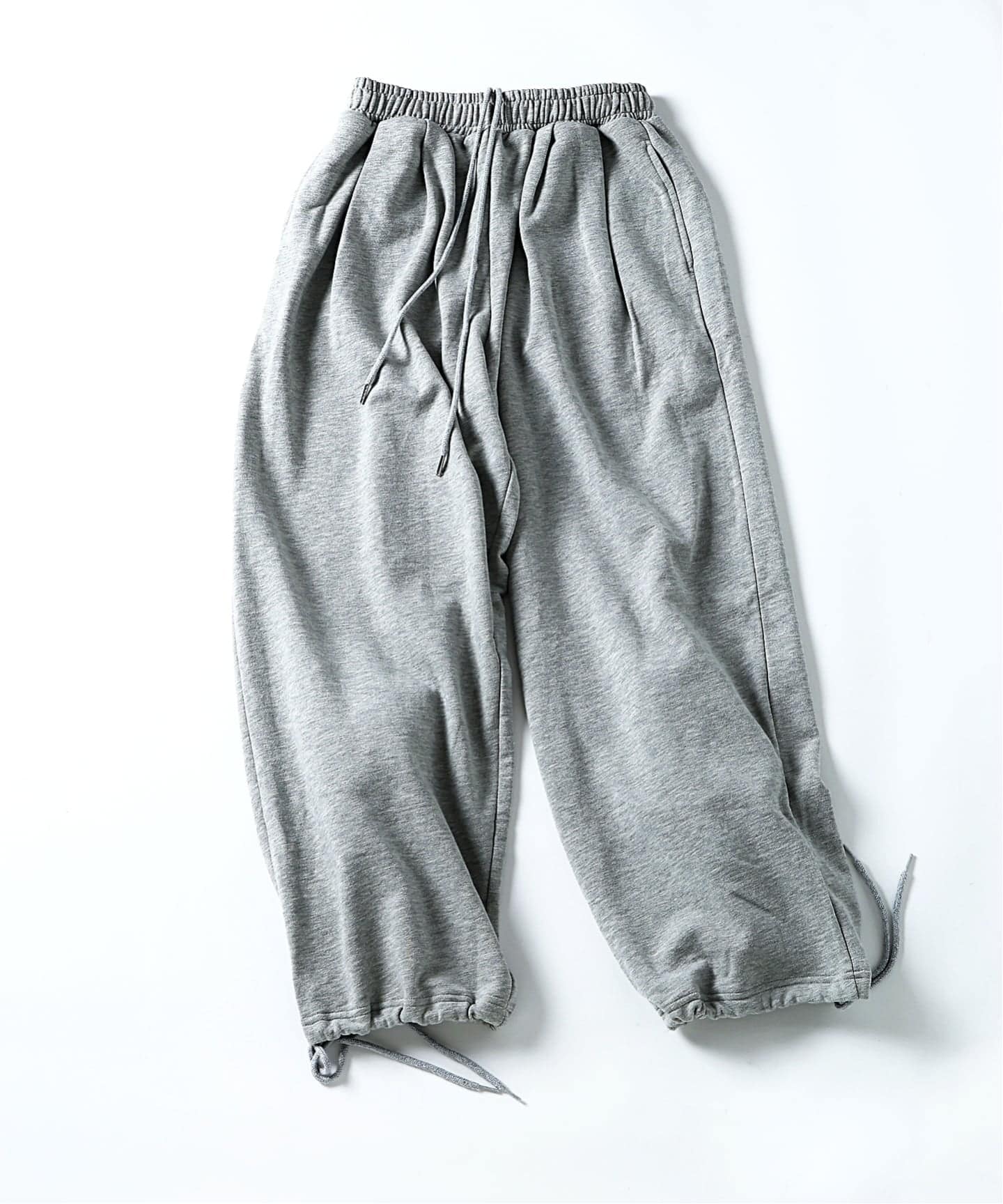 少し薄手でインナーにも使いやすく、トップスは着丈短めのボックスシルエット。パンツはワイドシルエットでスポーティ感少なめです。
