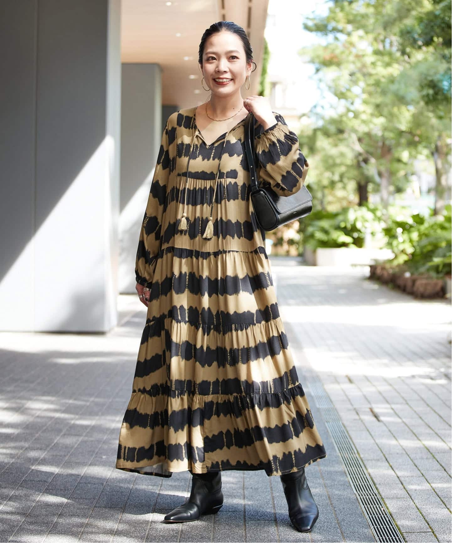モノトーンの小柄プリントが使いやすいティアードワンピース。