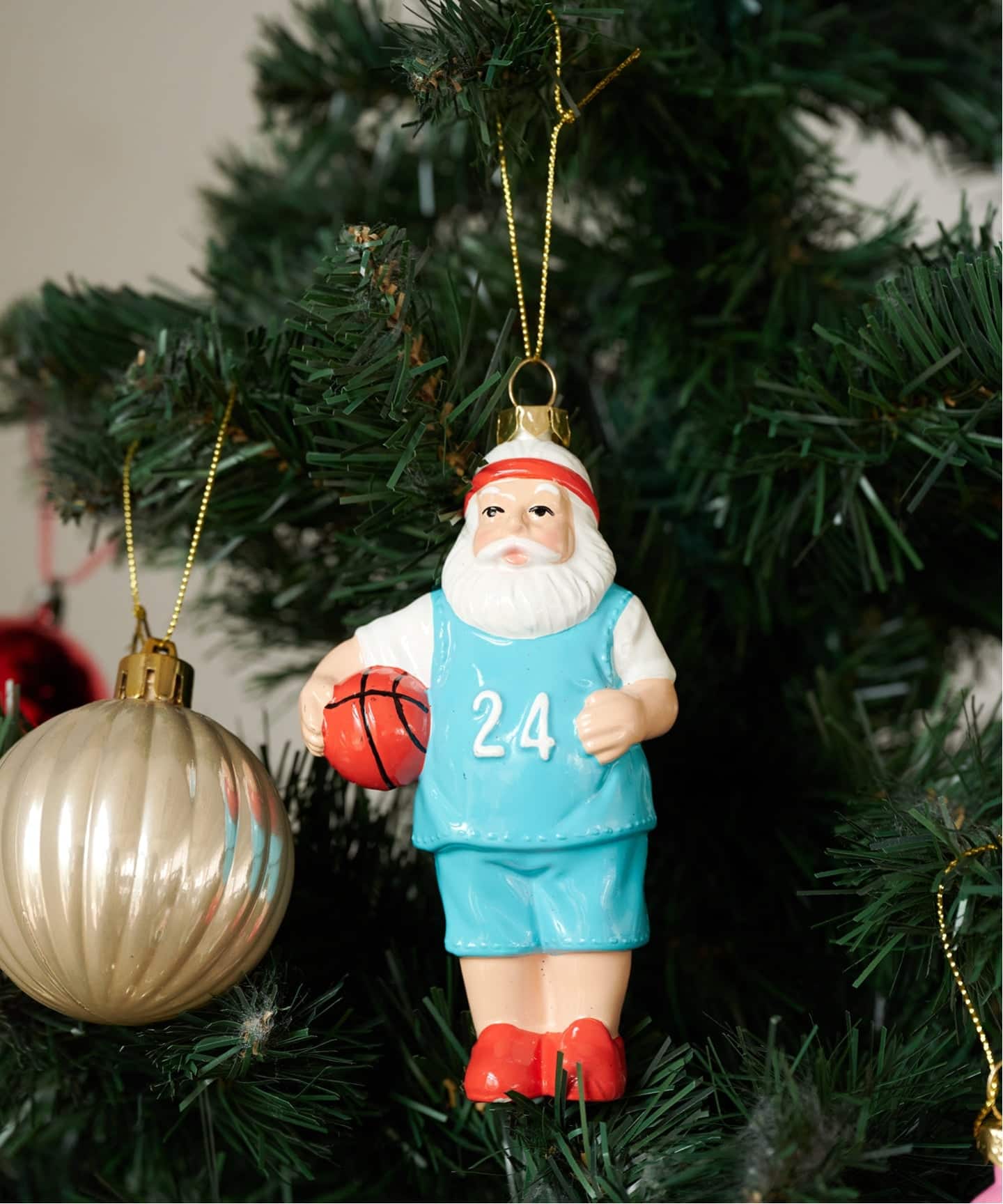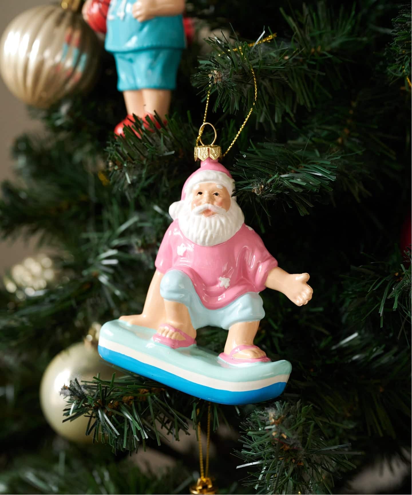 ダンベルを力強く持ち上げるサンタクロースや、サーフィンを楽しむサンタクロースなど、見ているだけで楽しくなるユニークなオーナメントシリーズ。