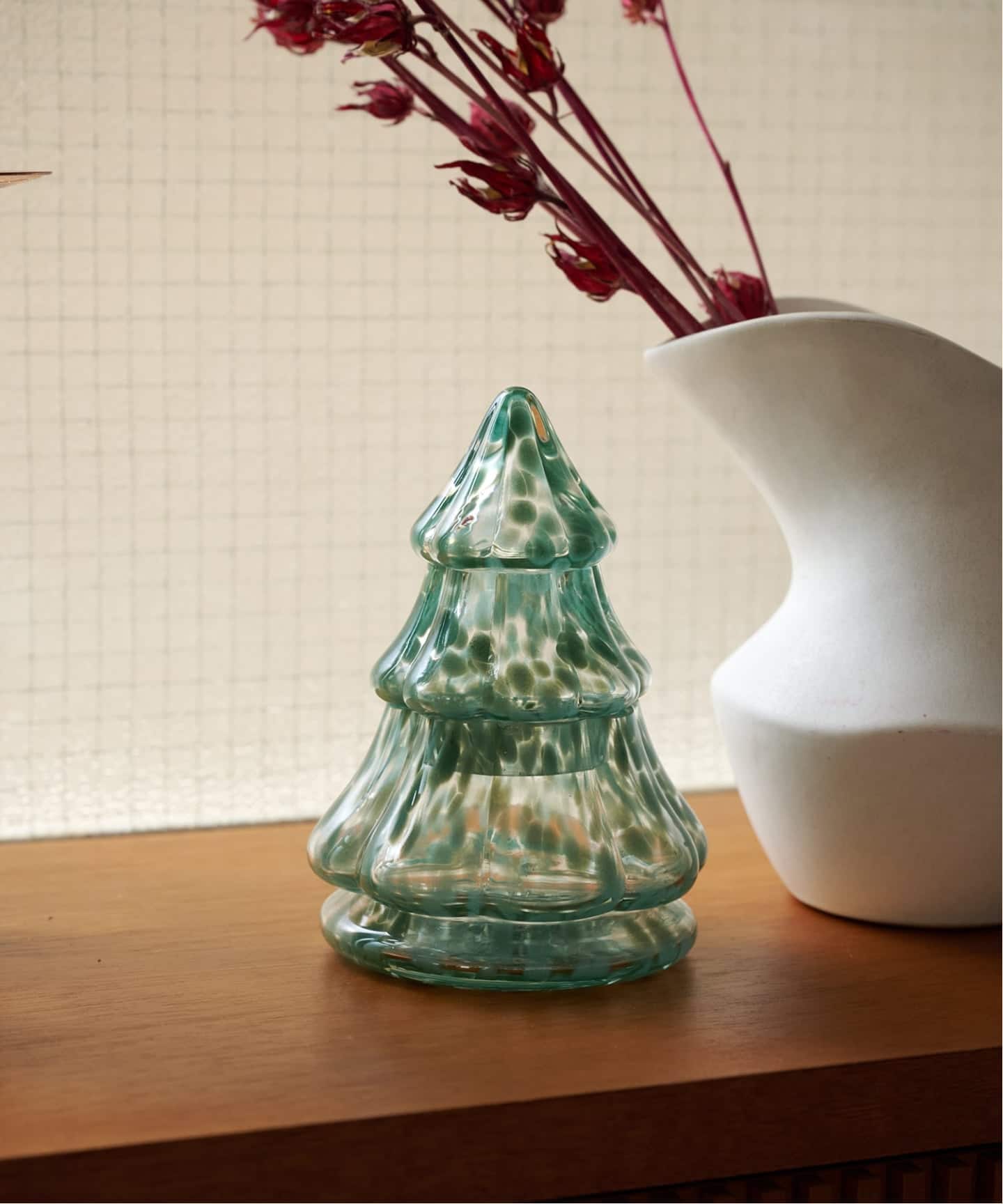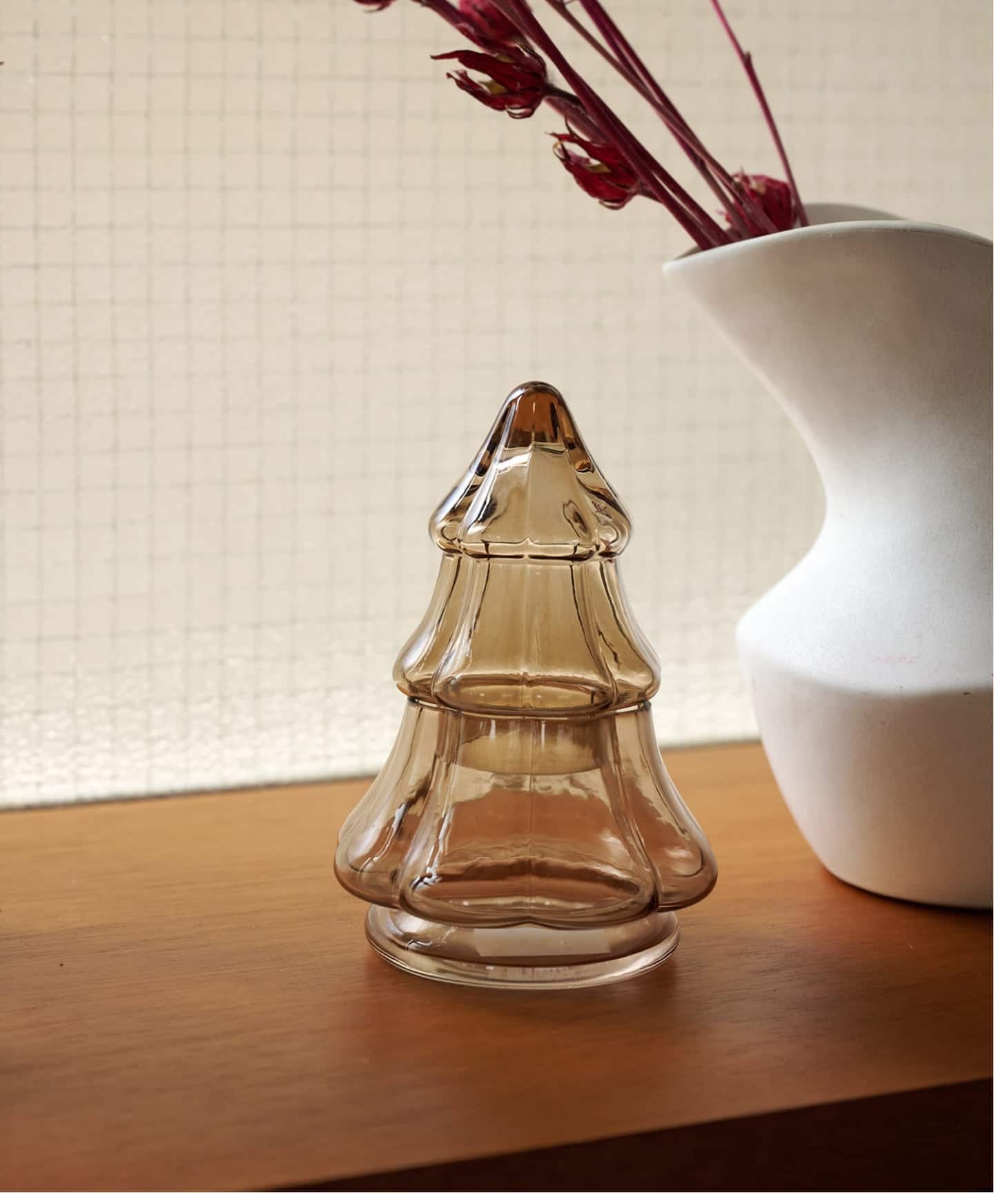 ガラスのクリスマスツリー型キャニスターは、季節感と実用性を兼ね備えたアイテム。