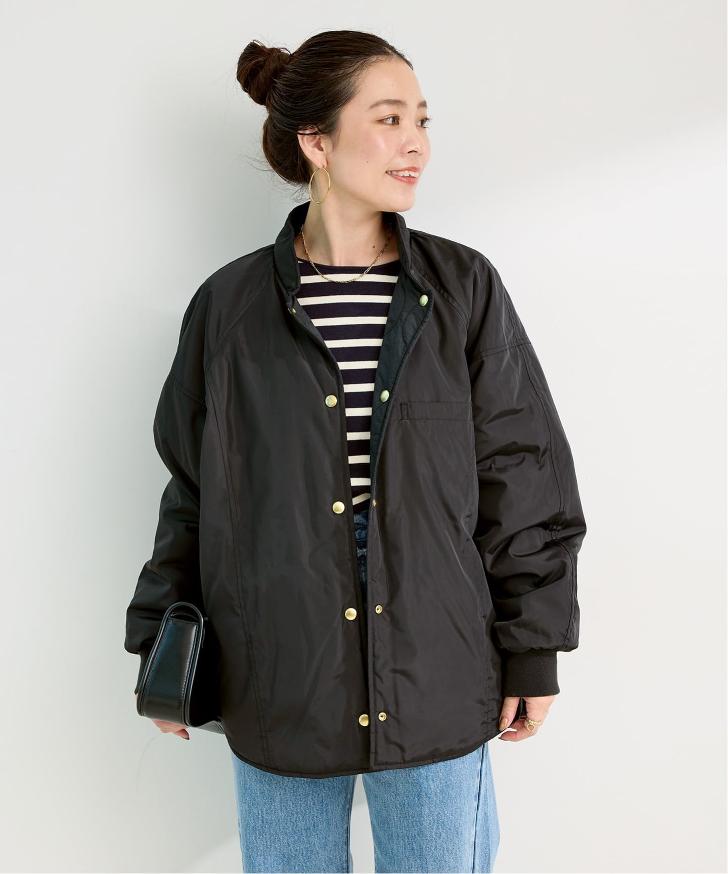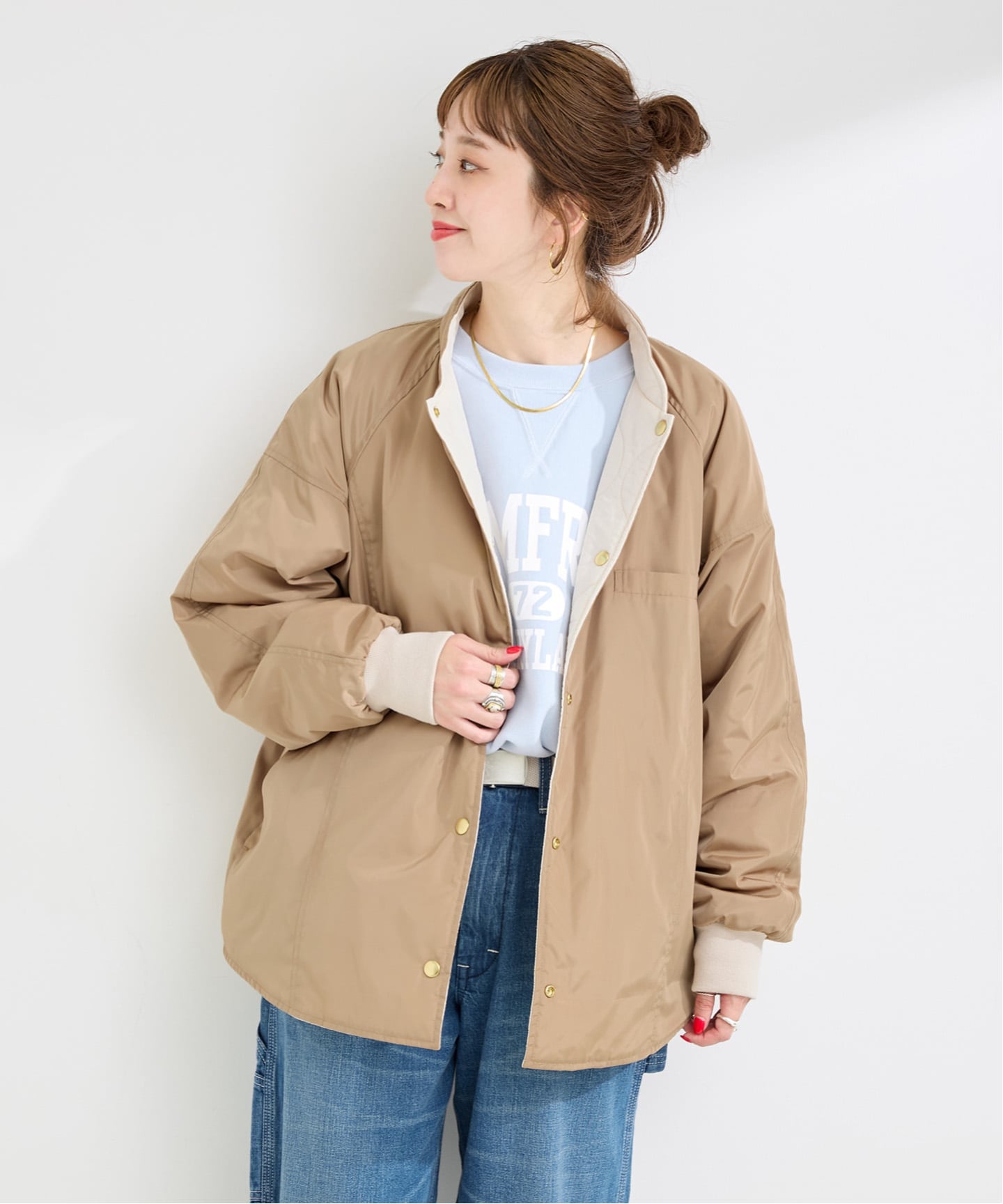 ベーシックなデニムに合わせたカジュアルスタイルから、裏面は落ち着いたトーンでオフィスカジュアルに使うのもおすすめです◎