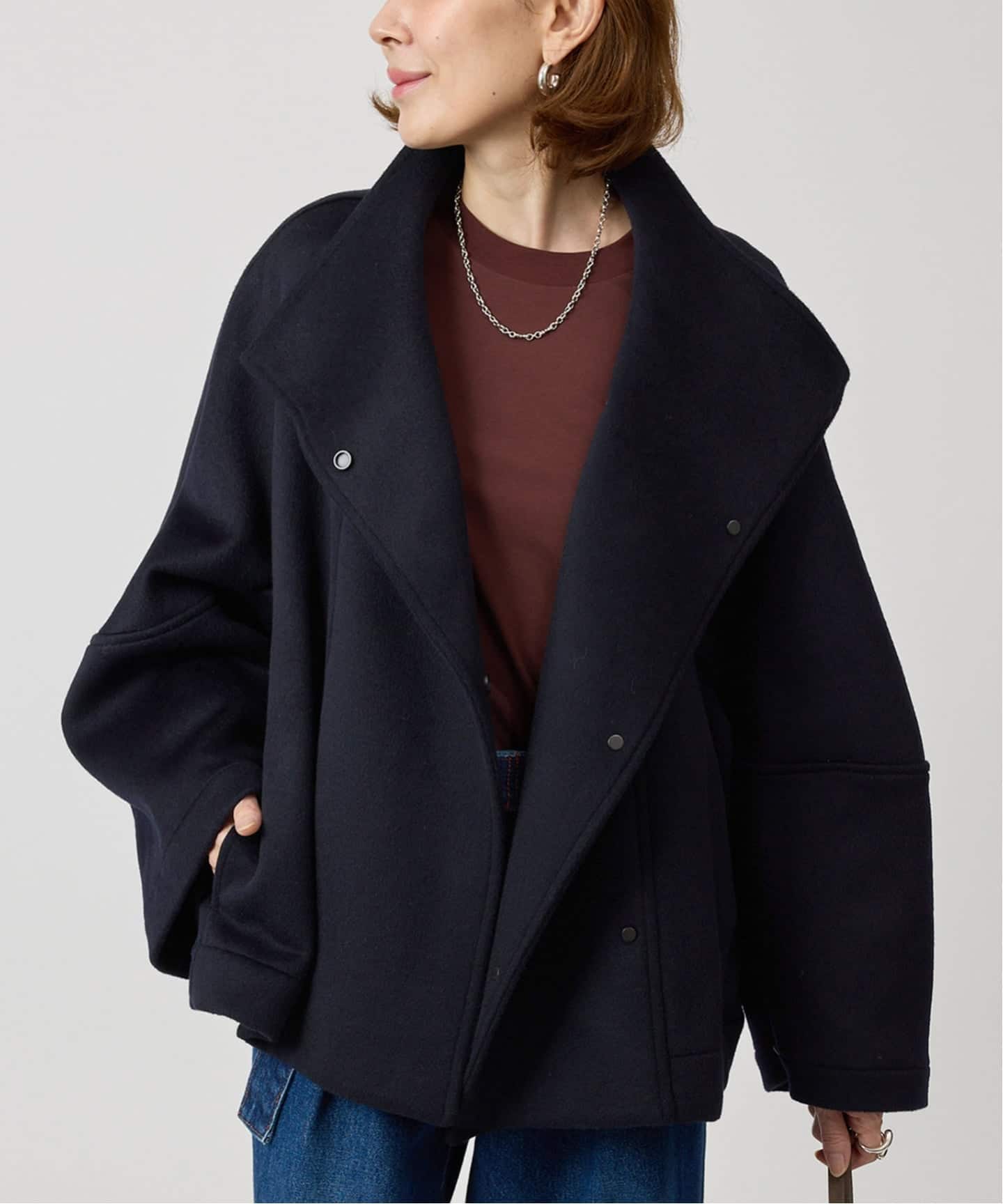 肩を落としたラインとゆとりのある身幅が、リラックス感と女性らしいフォルムを両立。