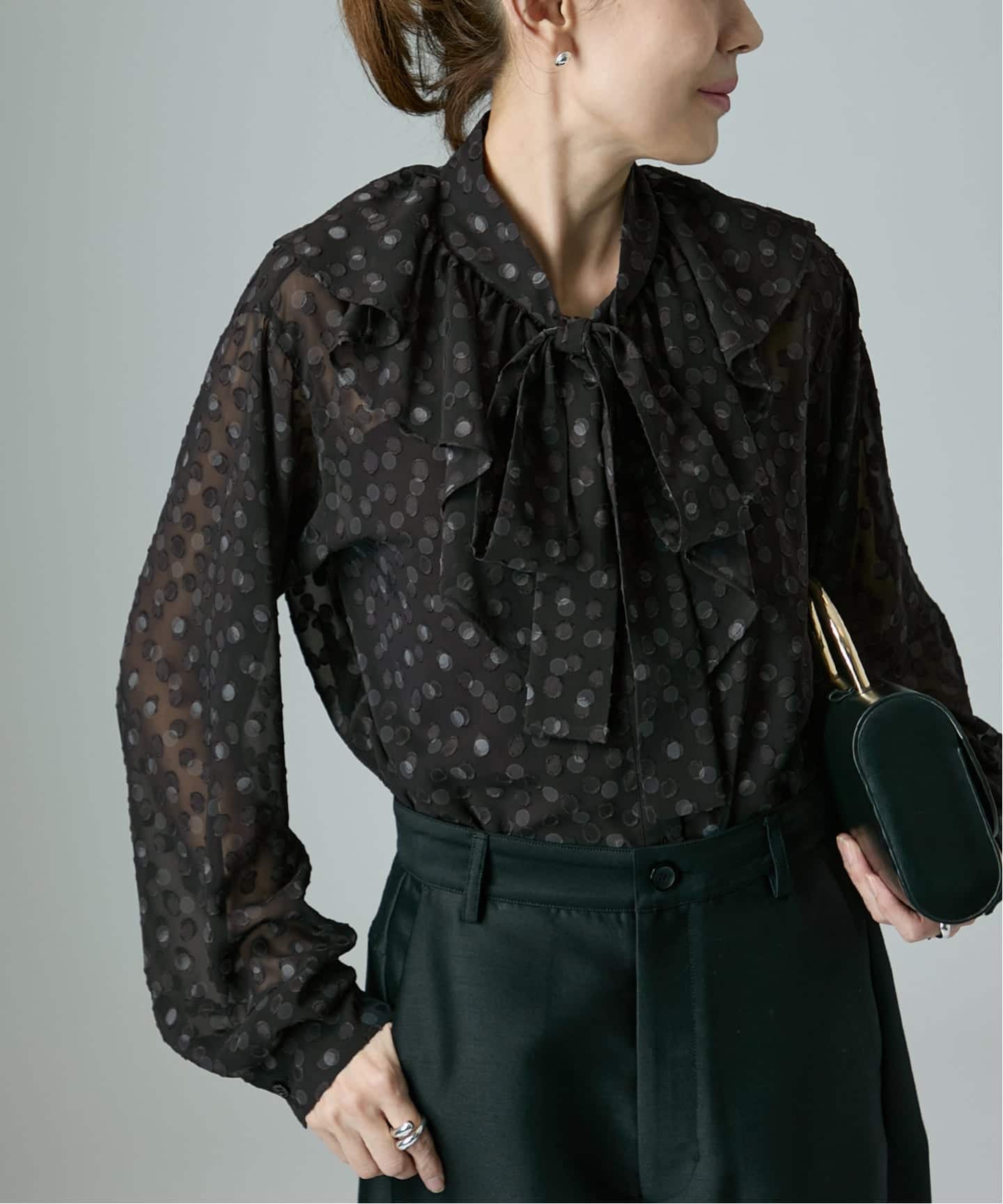 ボウタイとフロントのフリルが顔まわりを華やかに彩り、軽やかなシアー感がシーズンを通して心地よく着られる仕上がり。