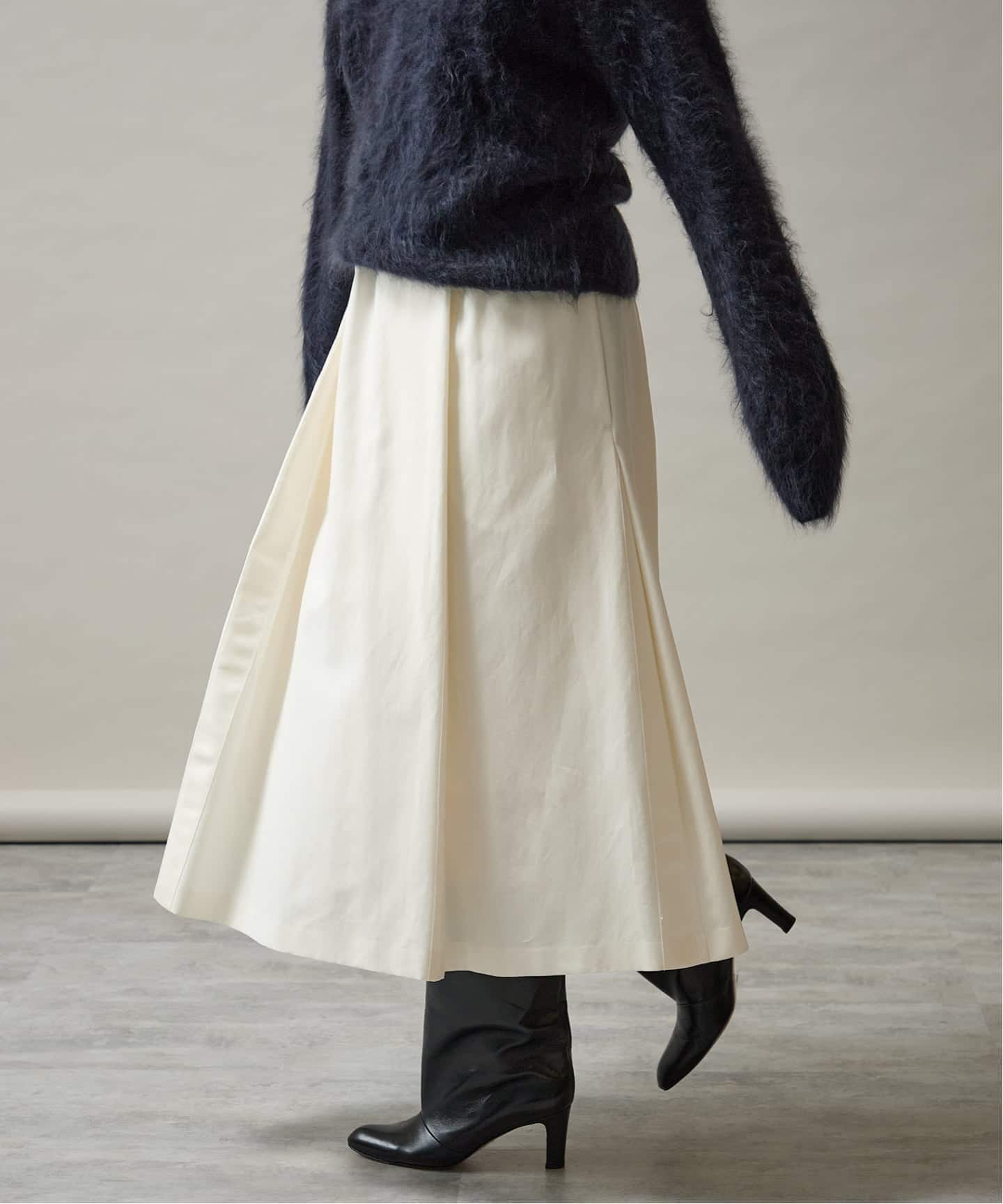 素材のハリを活かした設計により、動くたびに美しいシルエットを描きます。