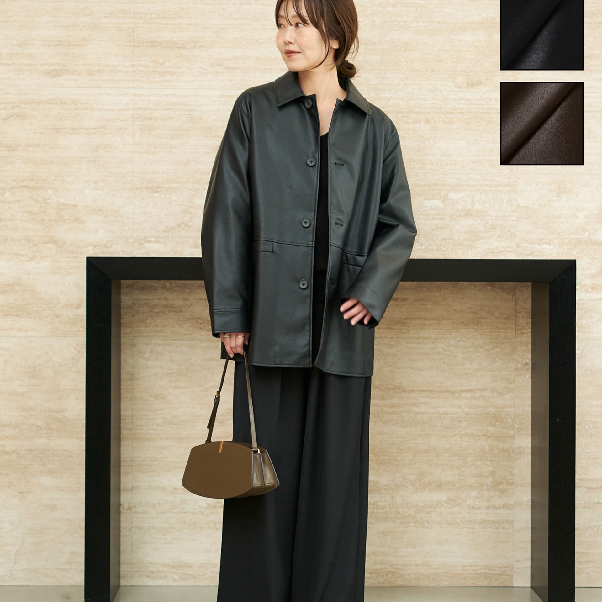 マットな質感のレザーライクジャケットを主役に、ブラックトーンで統一したシックなスタイリング。