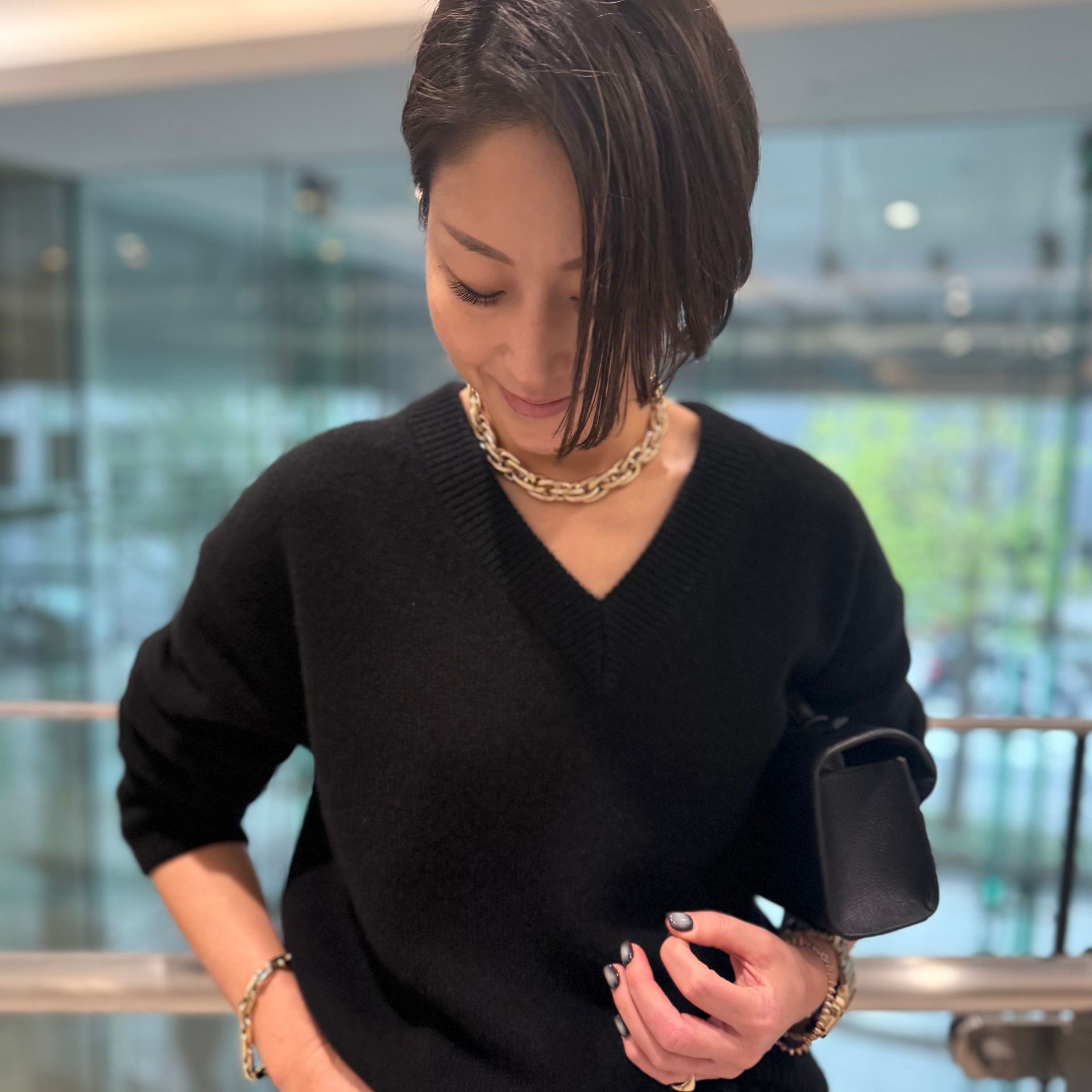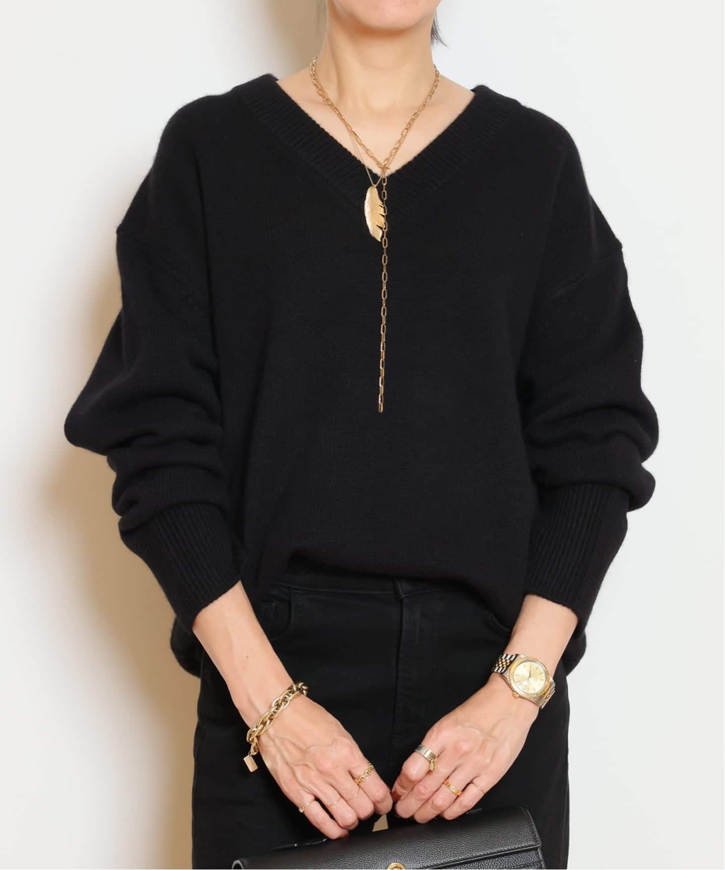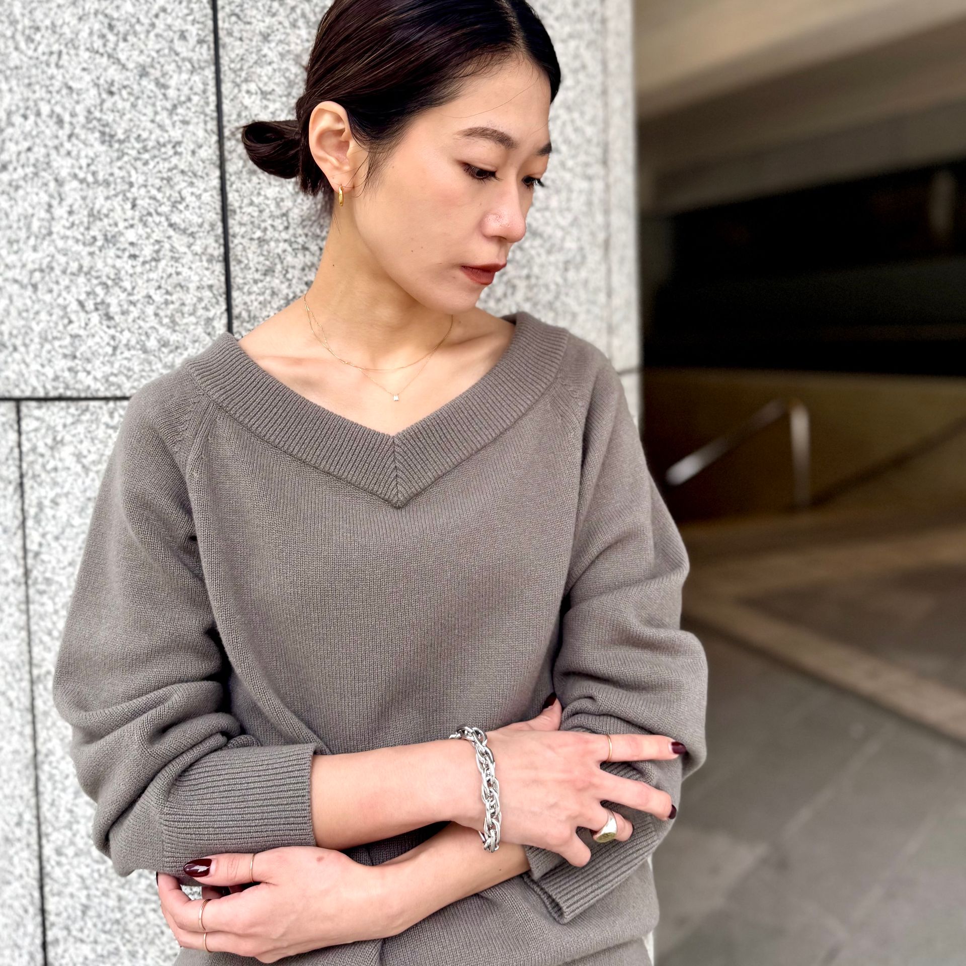 豊かなで柔らかなカシミアの風合い、開き過ぎないVネックラインからとびきりのジュエリーを飾れば、ニットも一気にドレスアップスタイルに。