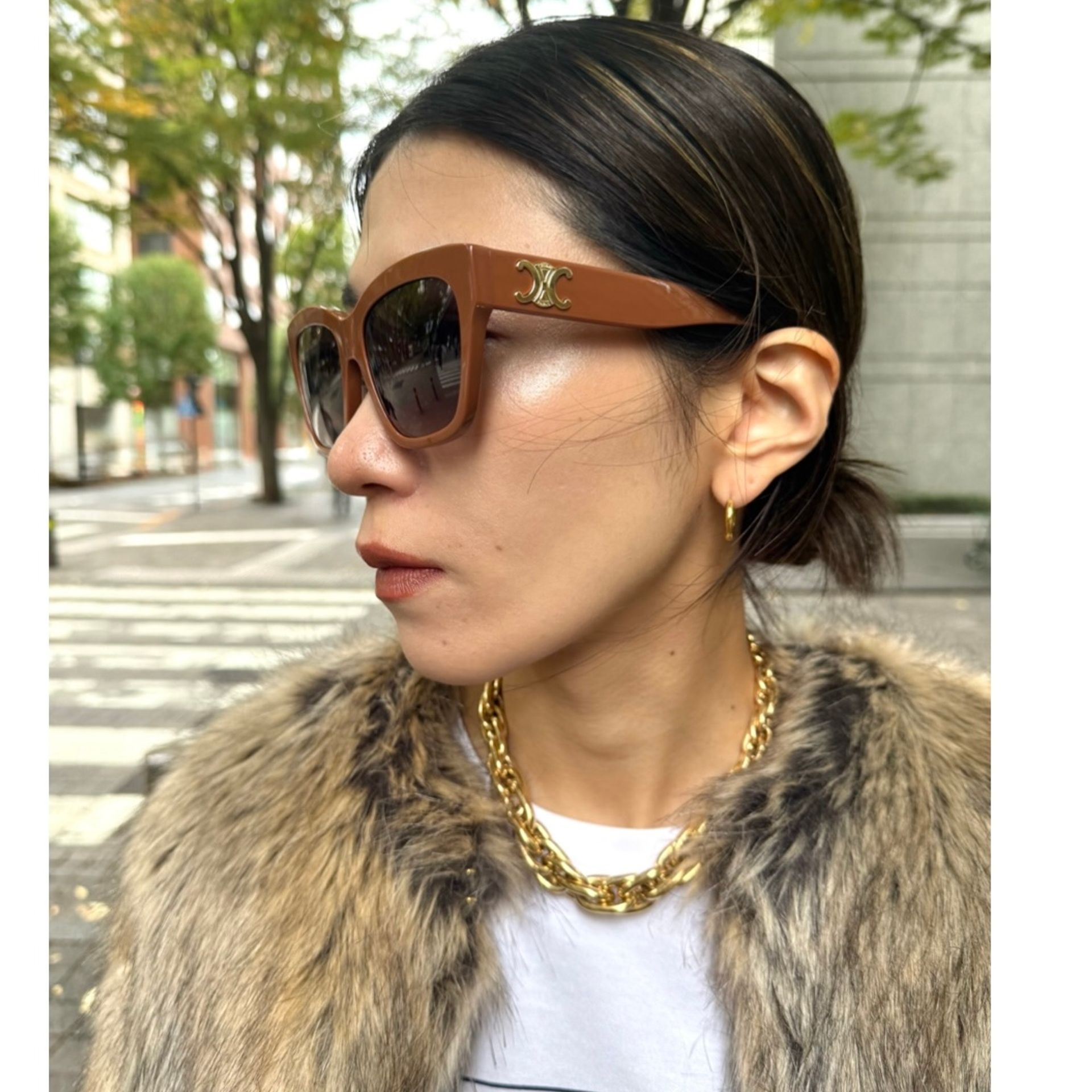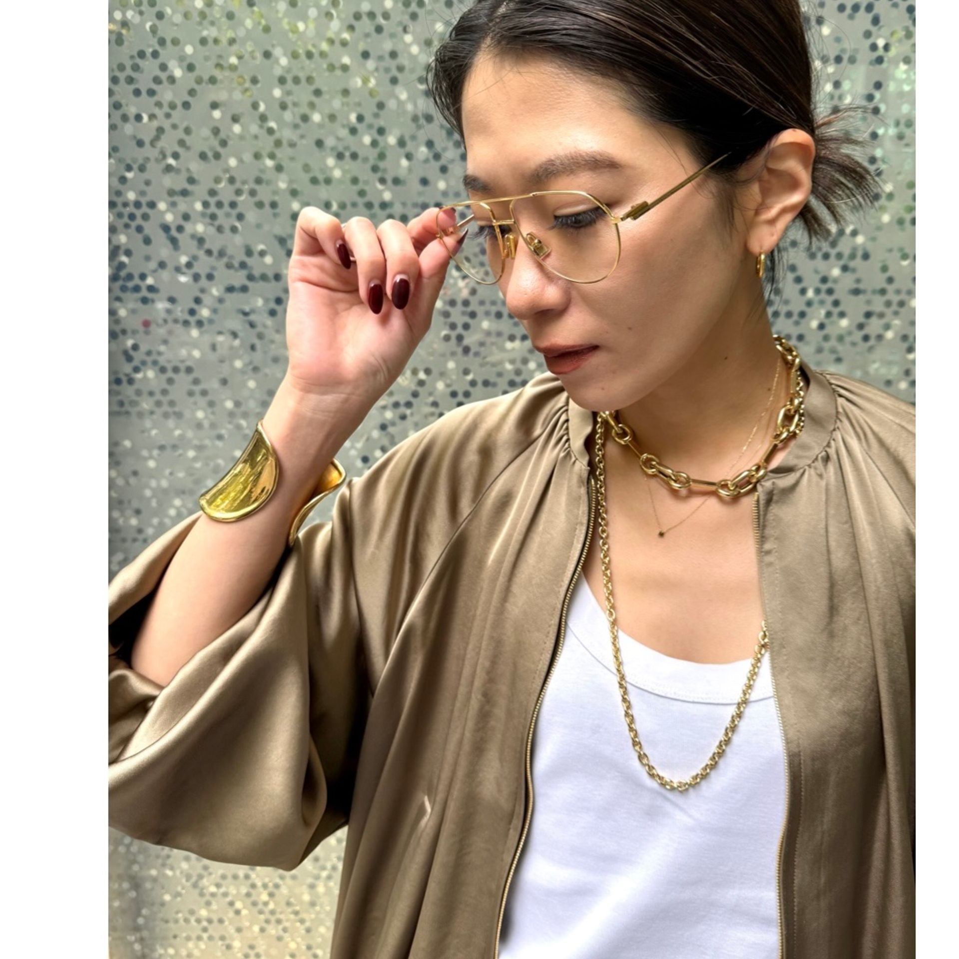 ダブルブリッジのゴールドフレームはタフさと艶感を兼ね備え、首元の箔のあるジュエリーたちともマッチ。