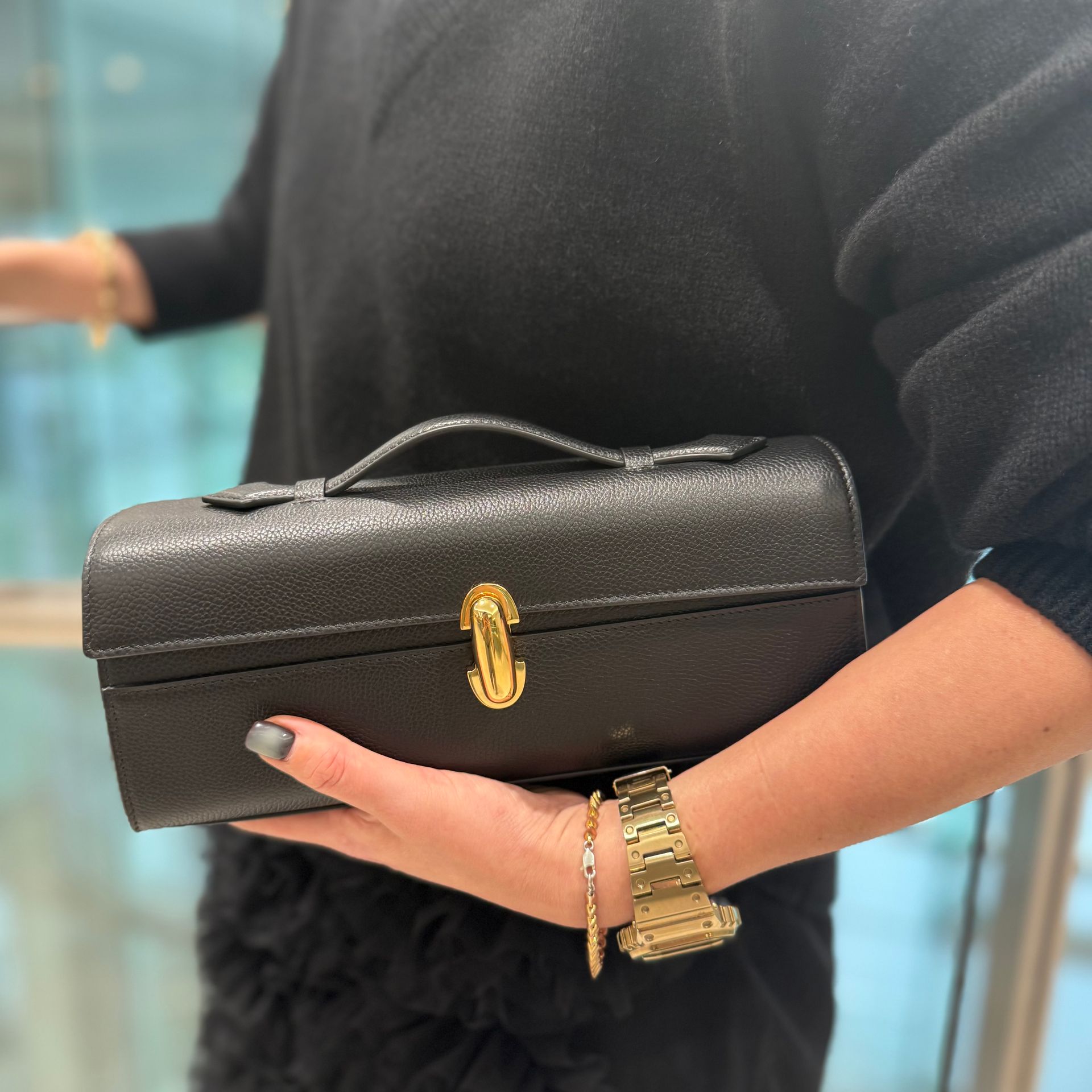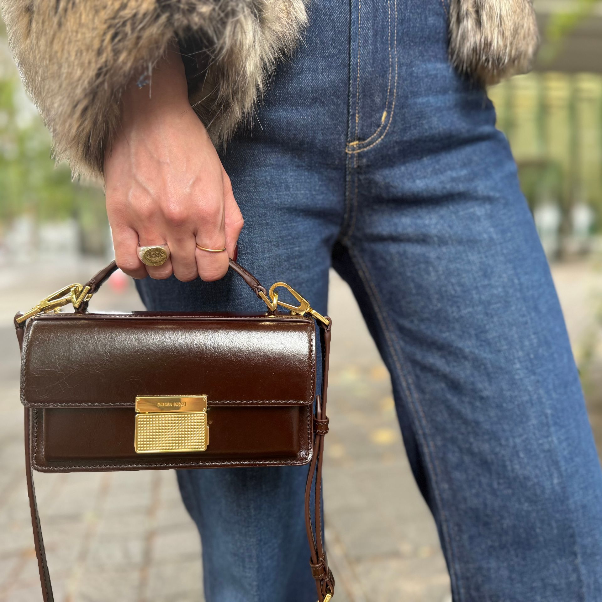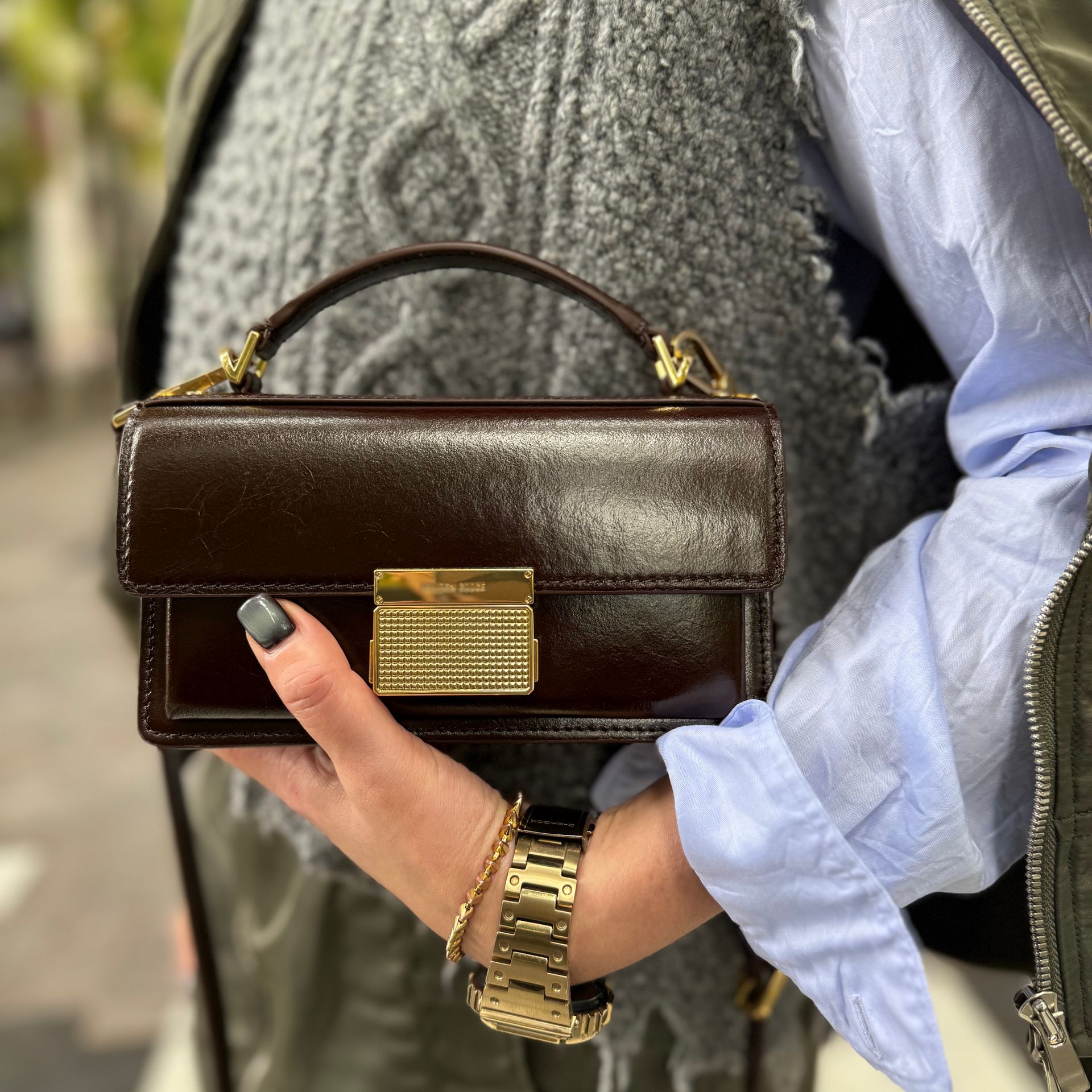 絶妙な茶色の色味と光沢感、ゴールドの大きな金具がシグネチャーデザインに。