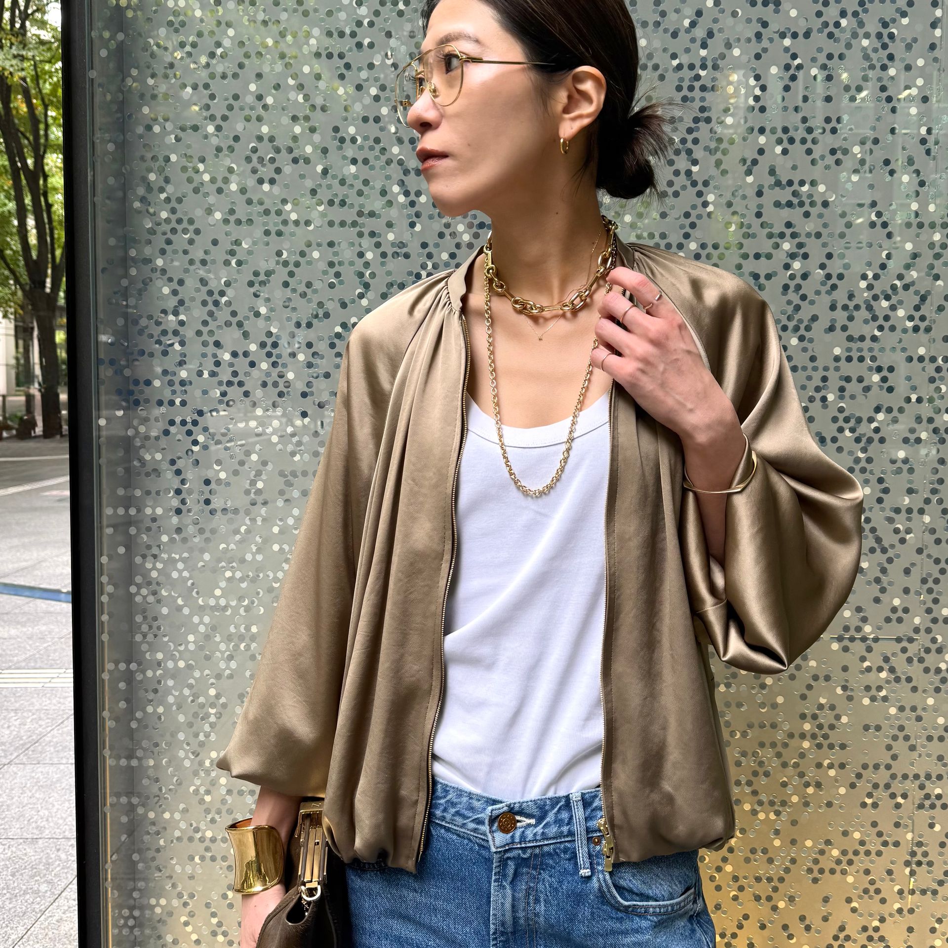 コルピエロのサテンブルゾンは、まるでブラウスのような優雅なデザインで、一枚で綺麗に着るのも素敵。