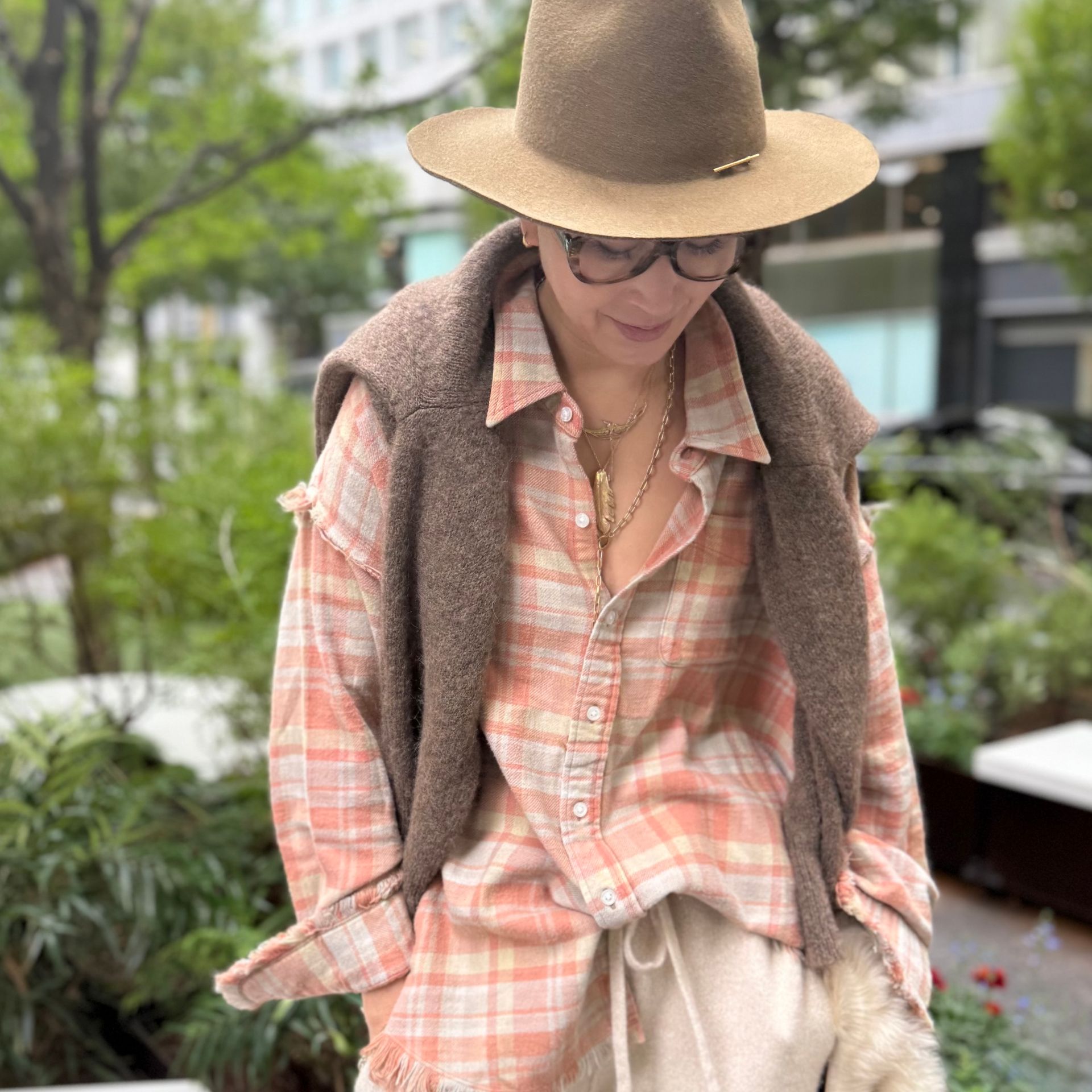 R13 のチェックシャツは、このサーモンピンクのような柔らかな色合いとクラッシュされたフリンジの縁取りがR13 ならではのディティール使いに。