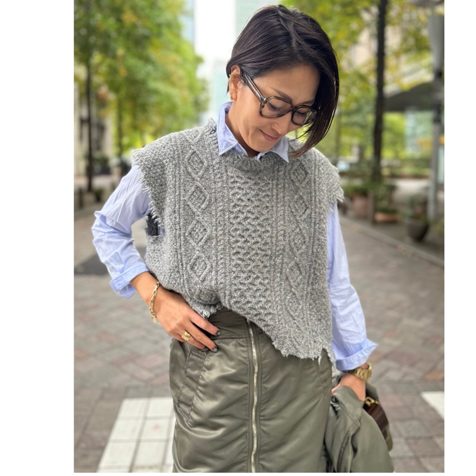 R13 のケーブル編みニットベストはシャツとのレイヤードを楽しみたい。
