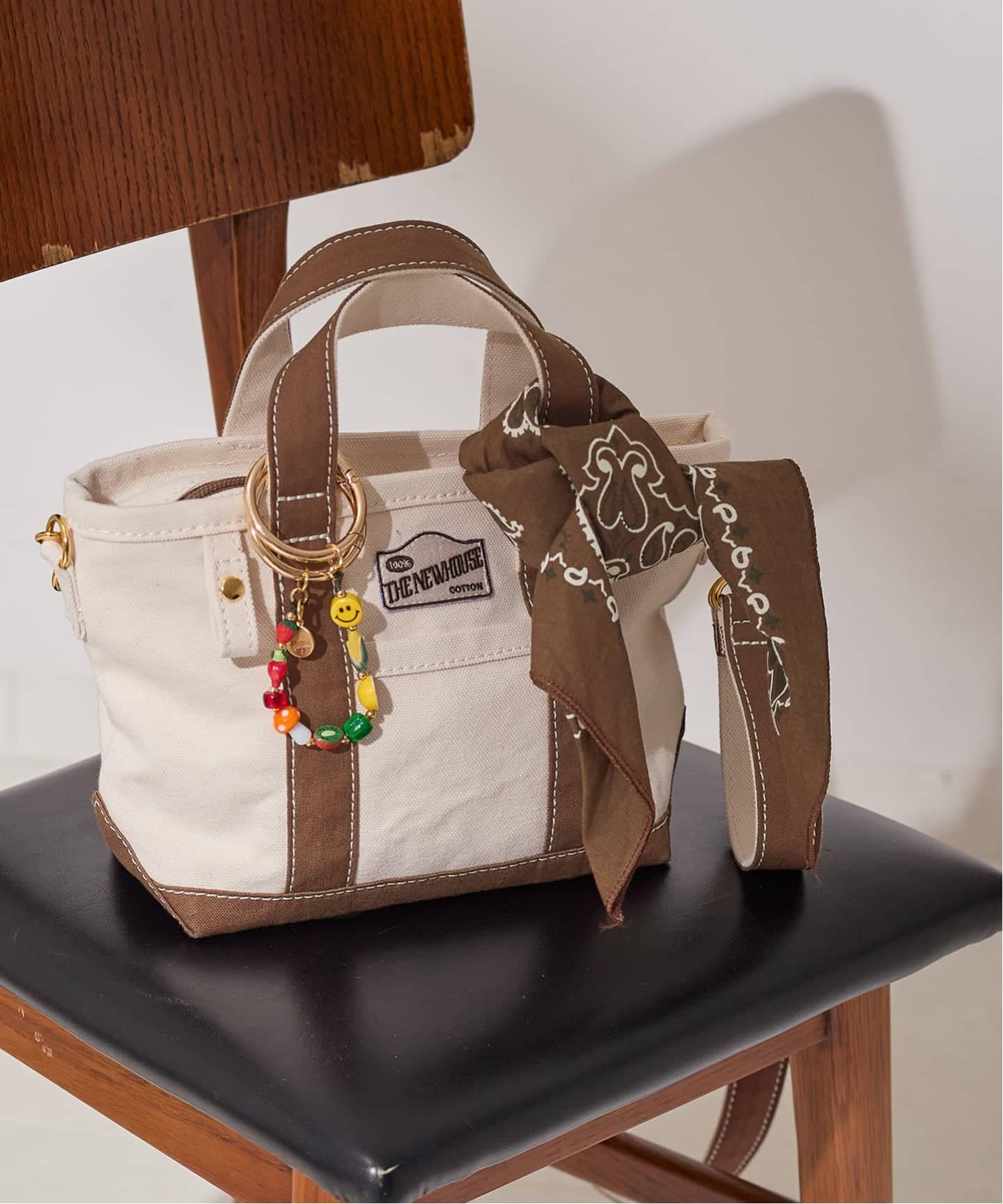 L’ESSAGE別注で上質感をプラスした特別なLEON TOTE。キャンバス地にブラウンを組み合わせた洗練されたデザインに、ゴールドの金具がアクセントとして映える仕様。付属のバンダナでアレンジも楽しめます。取り外し可能なショルダーストラップ付きで、肩掛け・手持ちの2WAY仕様。カジュアルな中にも品のある佇まいで、デイリーからきれいめスタイルまで幅広く活躍する万能トートです。