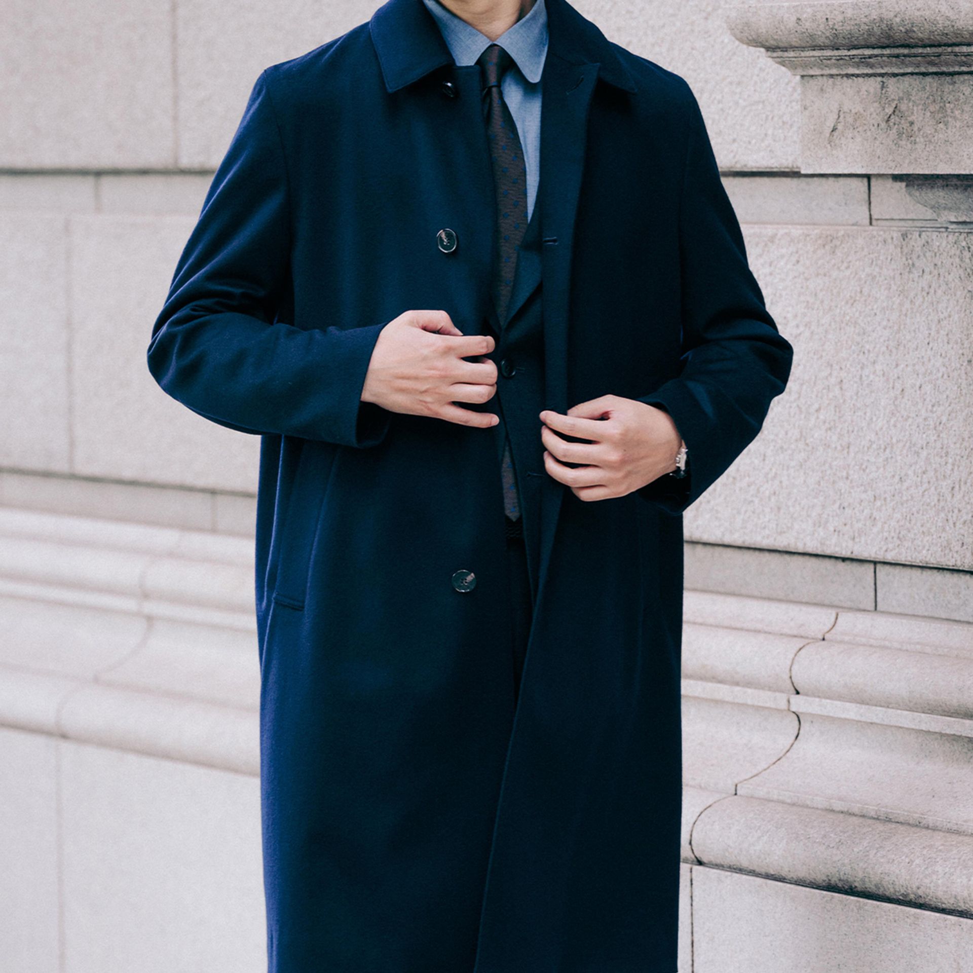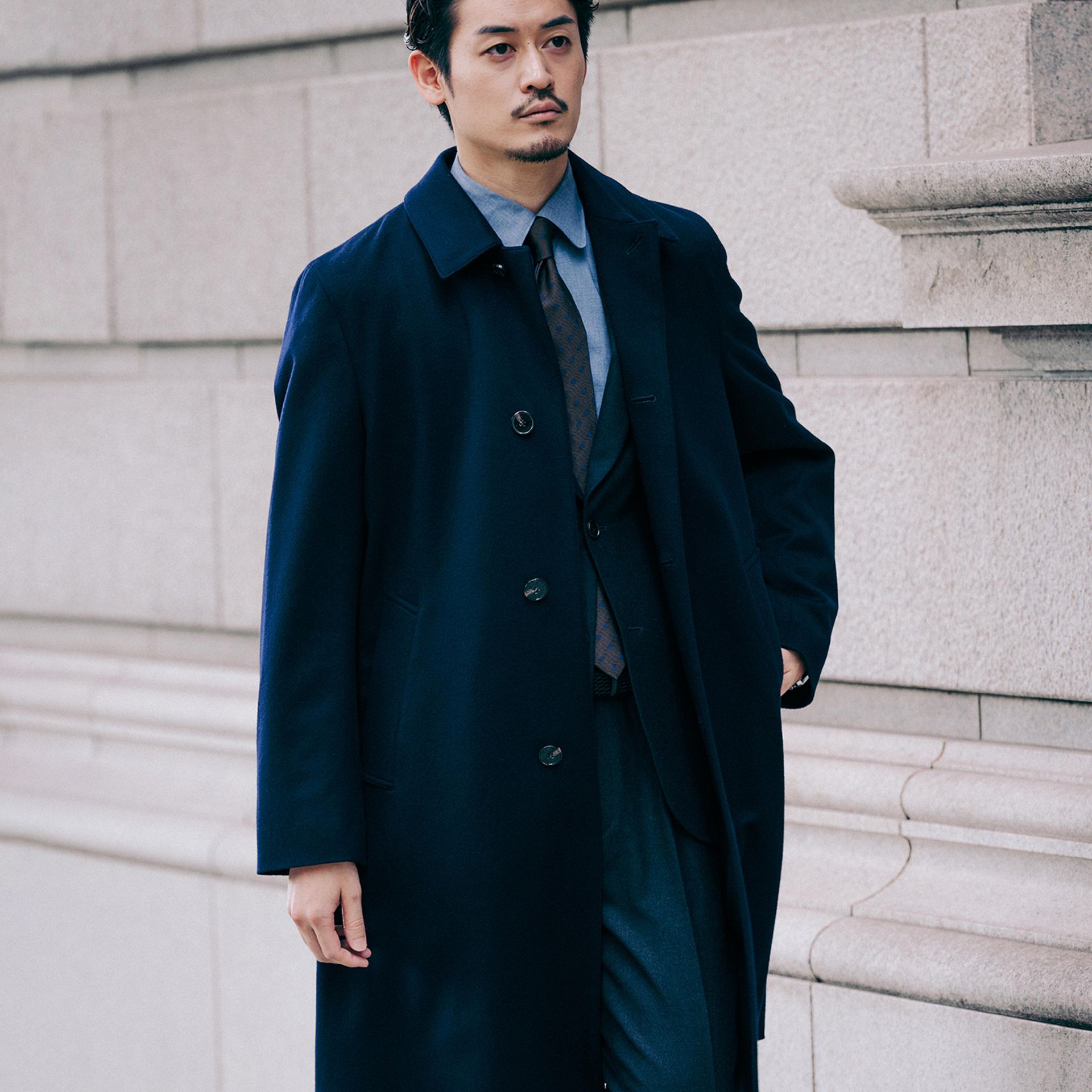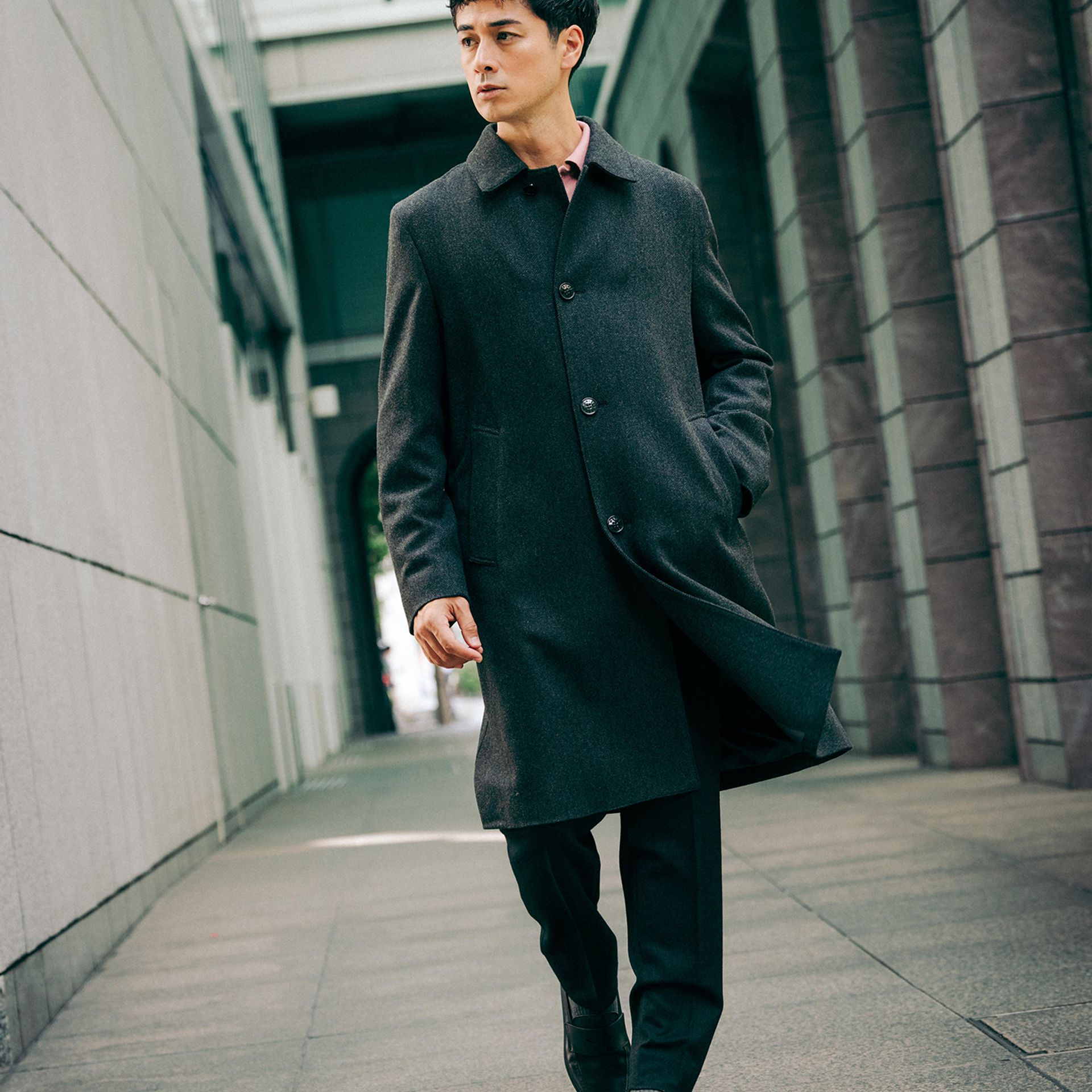ウールよりも軽くて光沢感があり、より気軽に羽織って出かけたくなる、肩肘張らずにカジュアルにも、スーツスタイルにもハマる、万能アウターです。