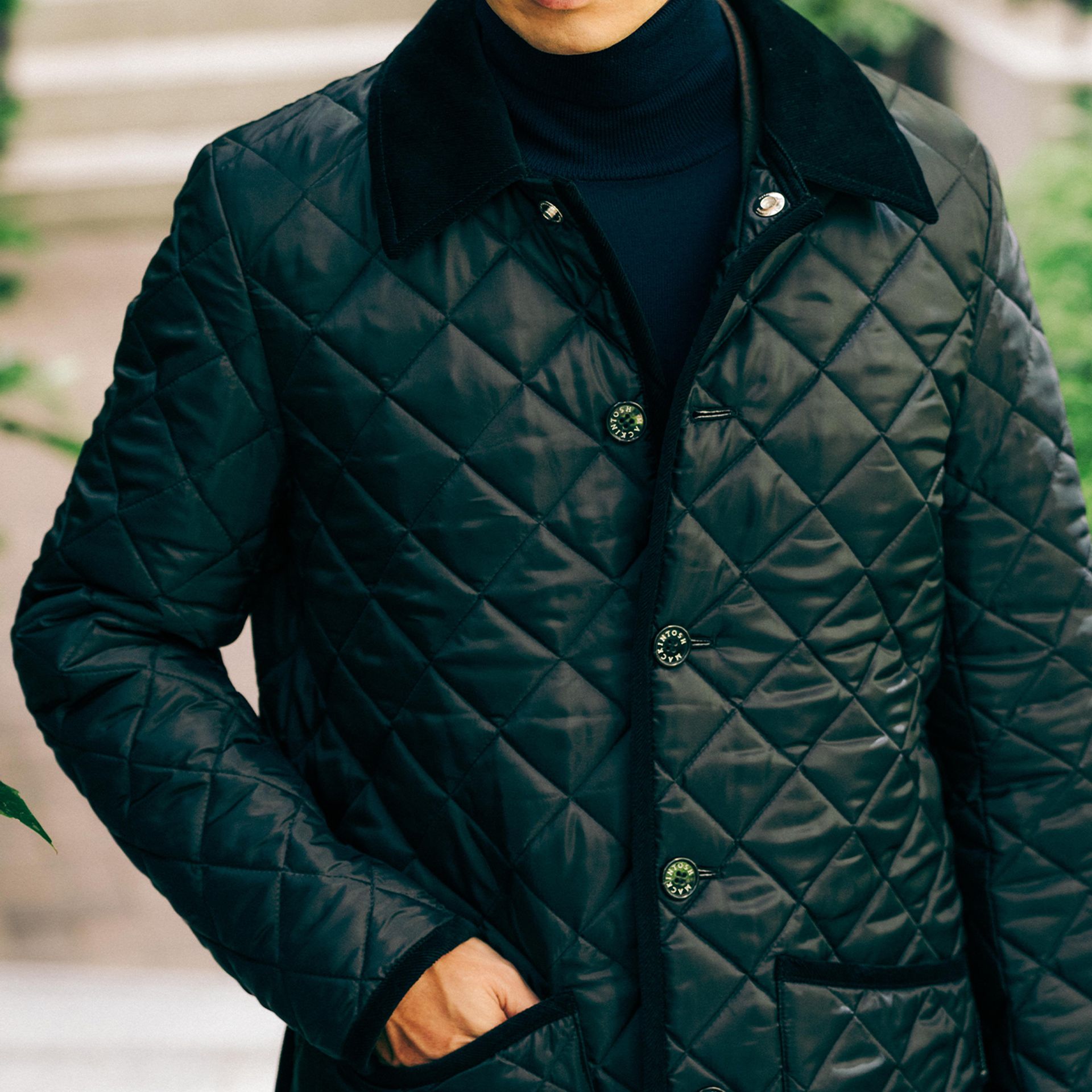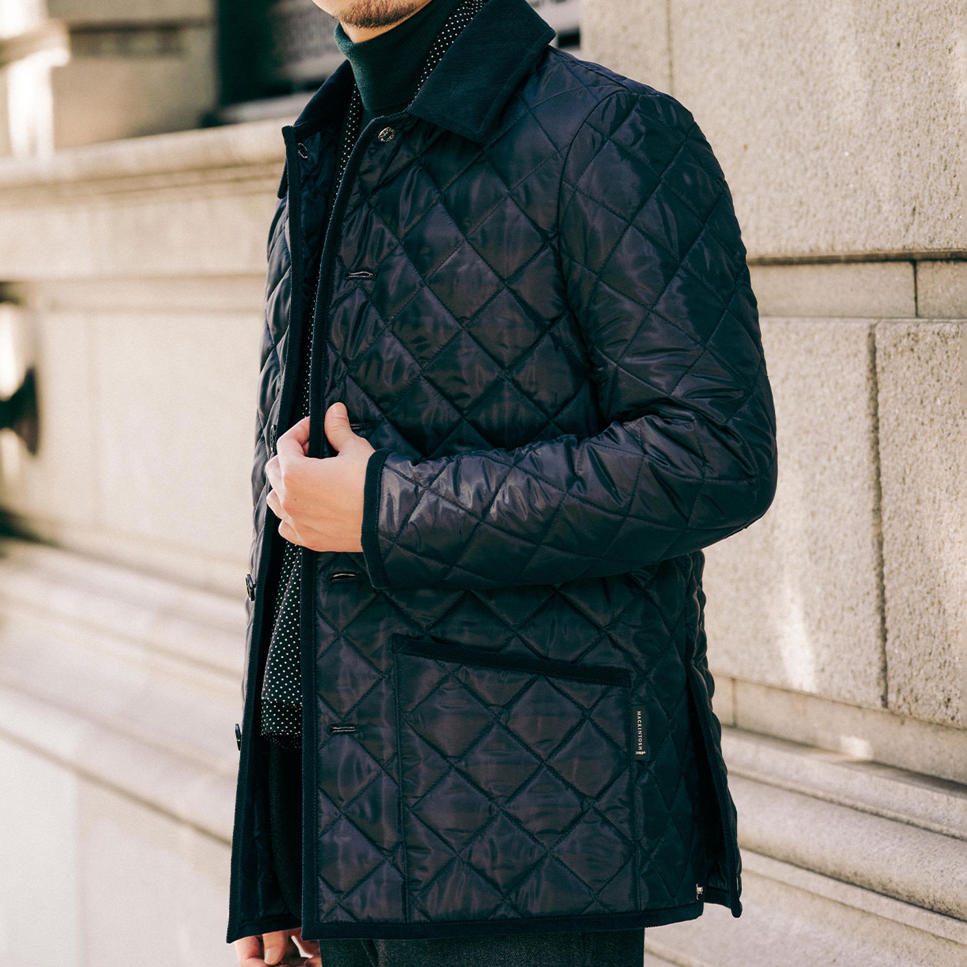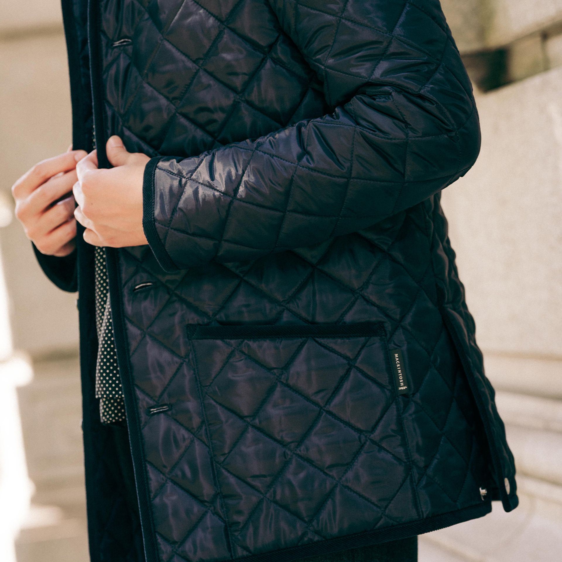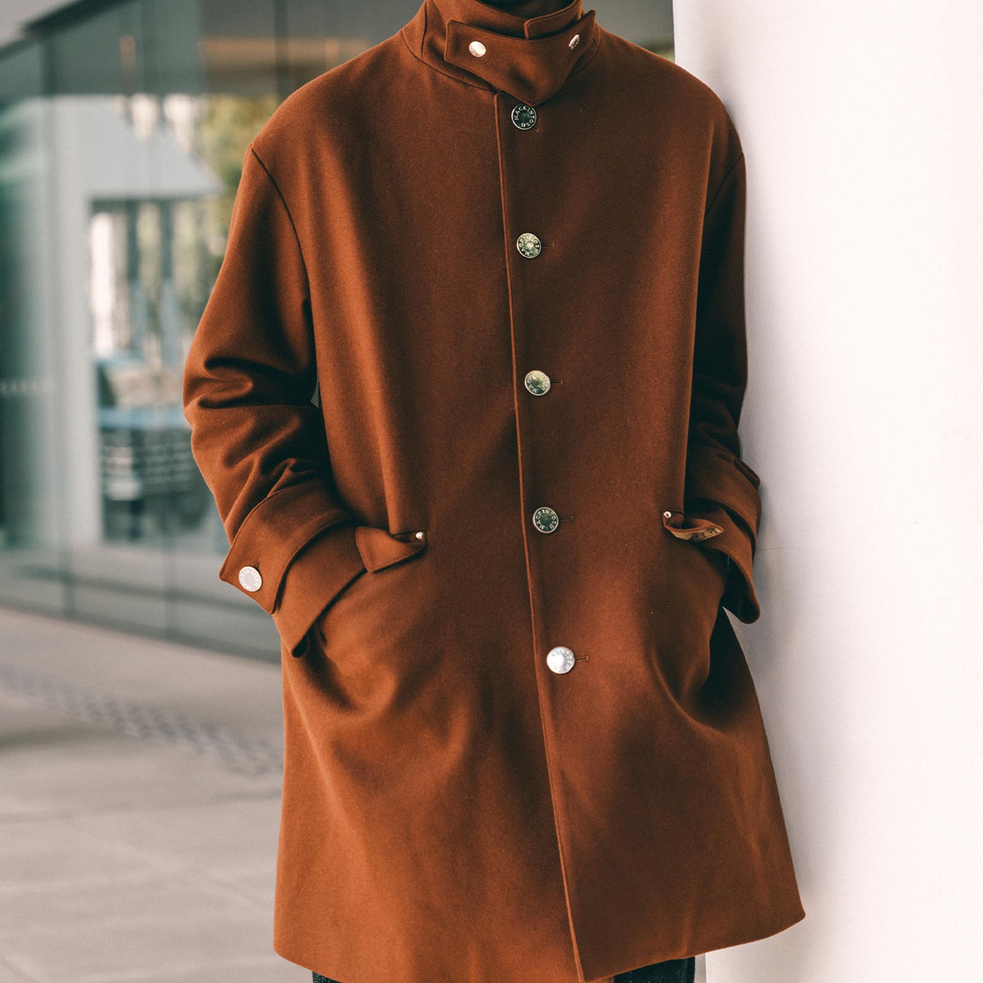 トップボタンにはMACKINTOSHを象徴するメタルボタンを採用し、裏地には赤いウール素材を使用。アームホールや袖周りを調整することで、厚手のインナーにも快適に対応します。