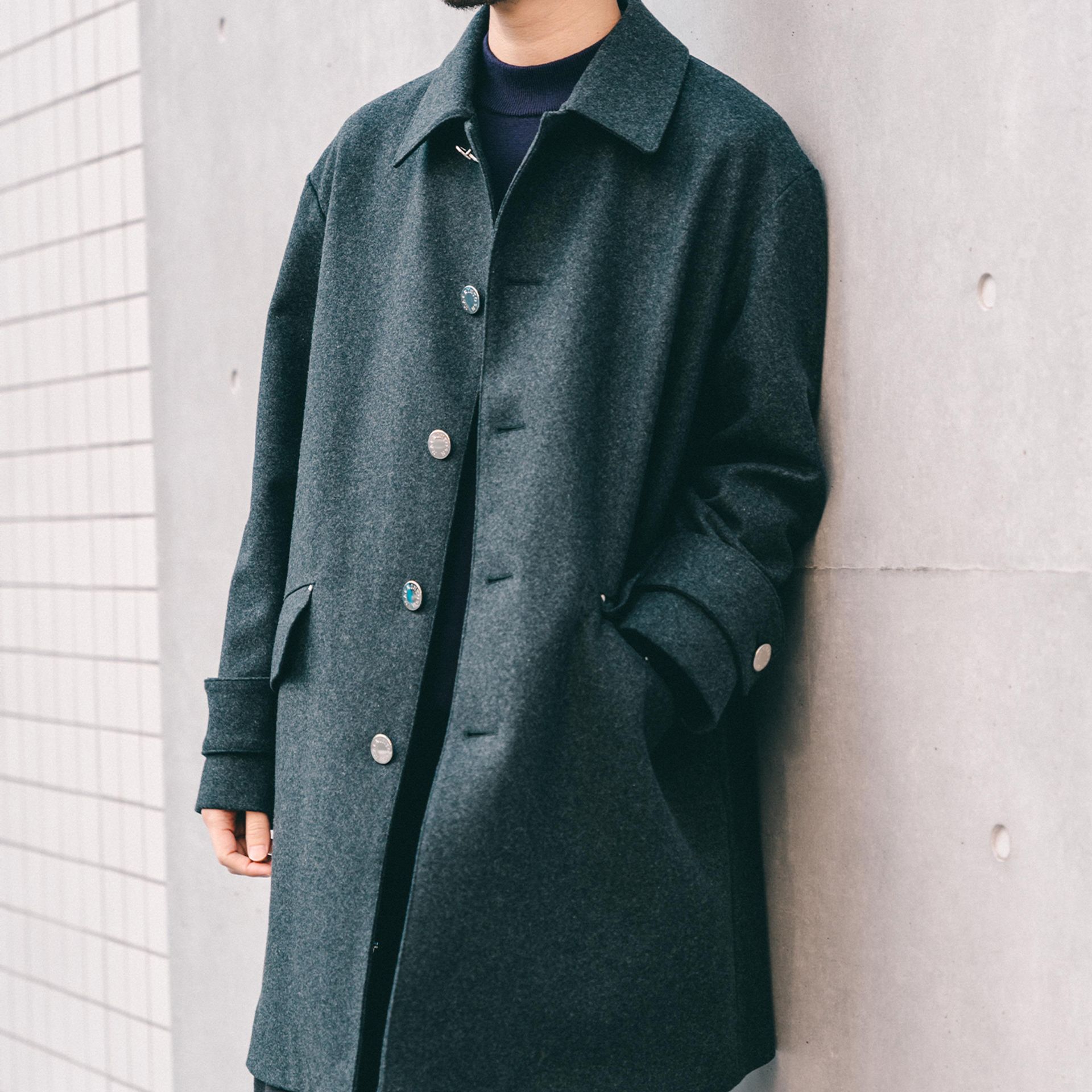 昨年好評を博したスリムシルエット「HUMBIE SL」をベースに、上質な無地ウール素材を採用。ロゴボタンはシルバーボタンに、チンタブにはドットボタンを配するなど、細部にも上品さをプラス。