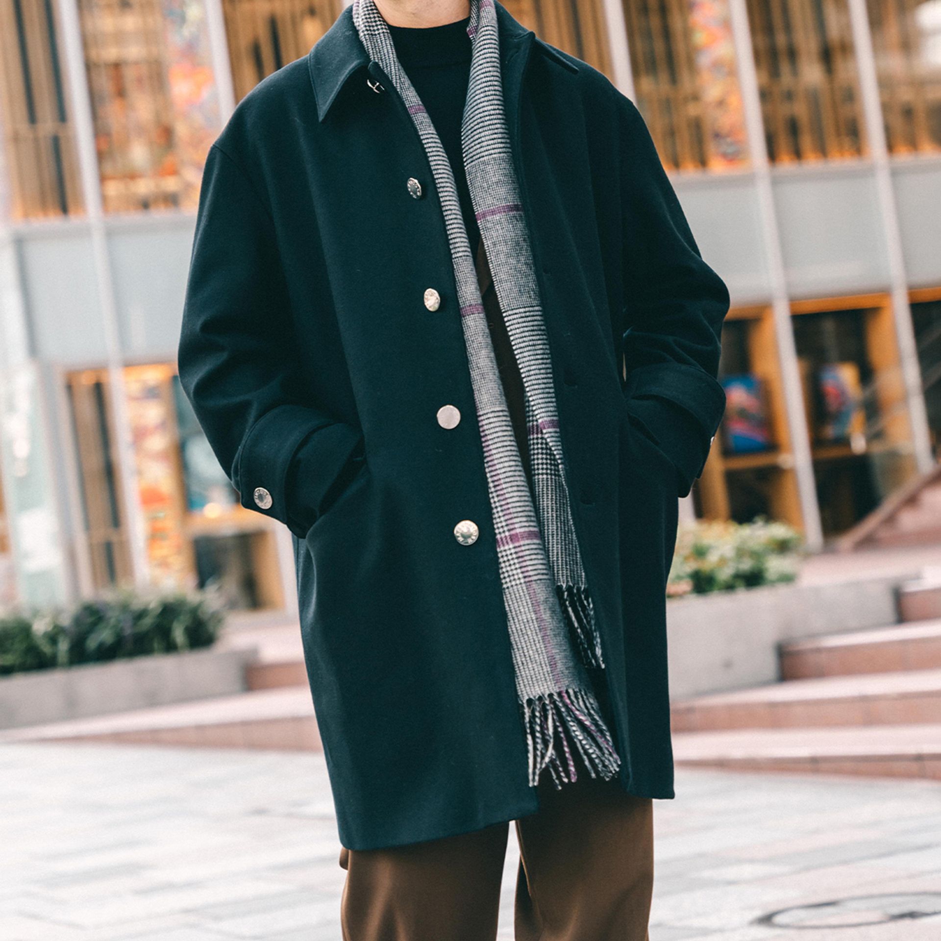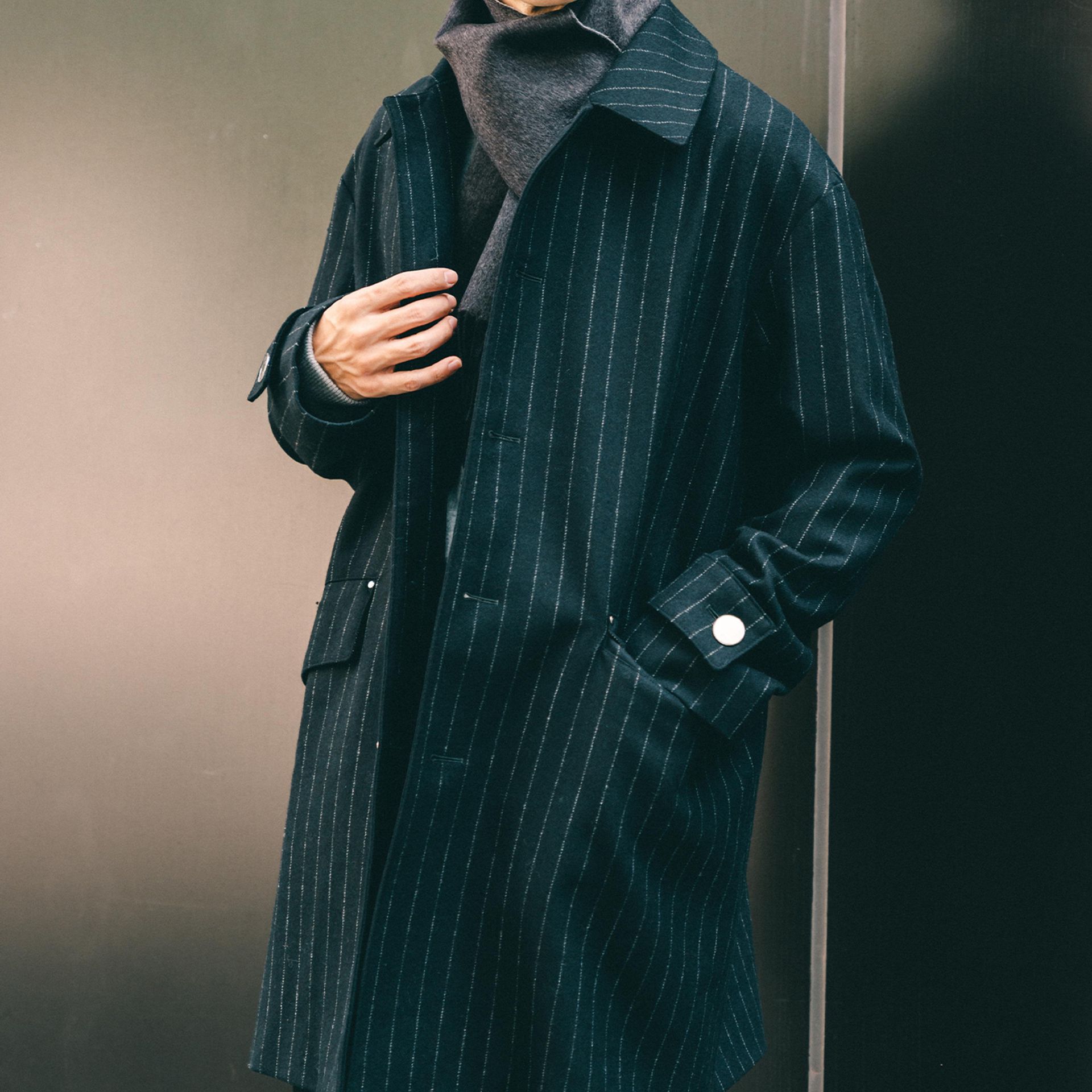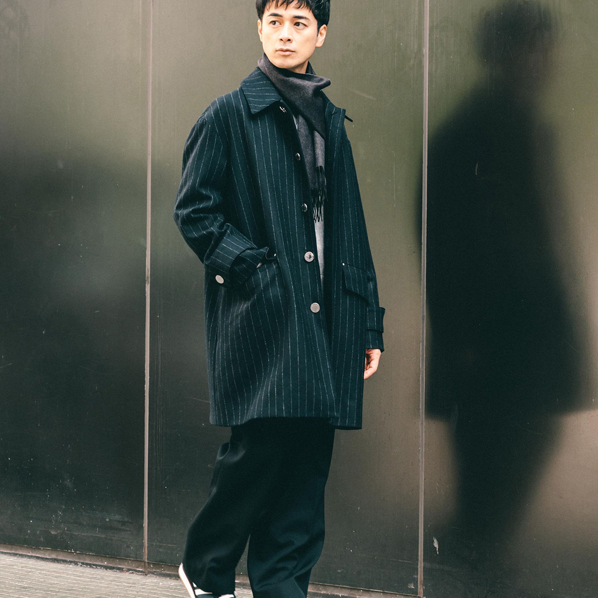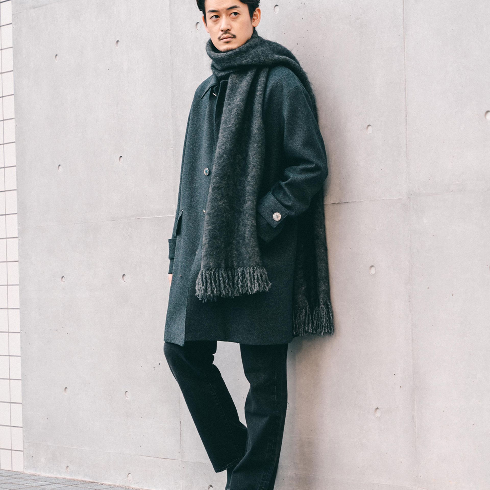 冬場は、トップスにニットや、ボトムにウールスラックスなどウール素材の着こなしが増えるので、アウターの着こなしを軽やかにしてくれます。
