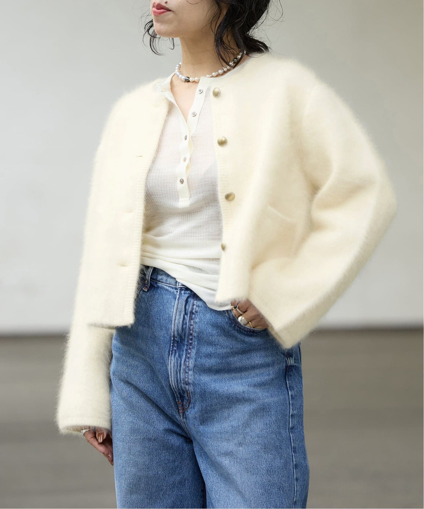 ホワイトのニットは私もリアルバイ!一点ずつハンドメイドで、凹凸感やクラフト感あるボタンに温かみを感じます。