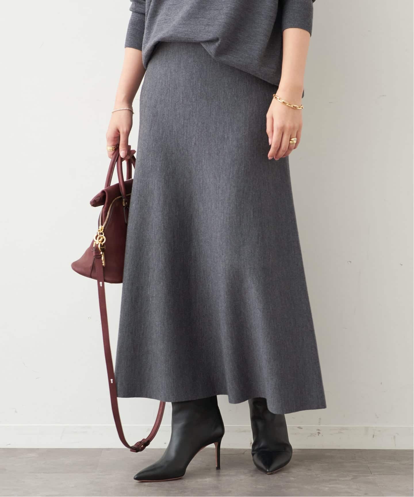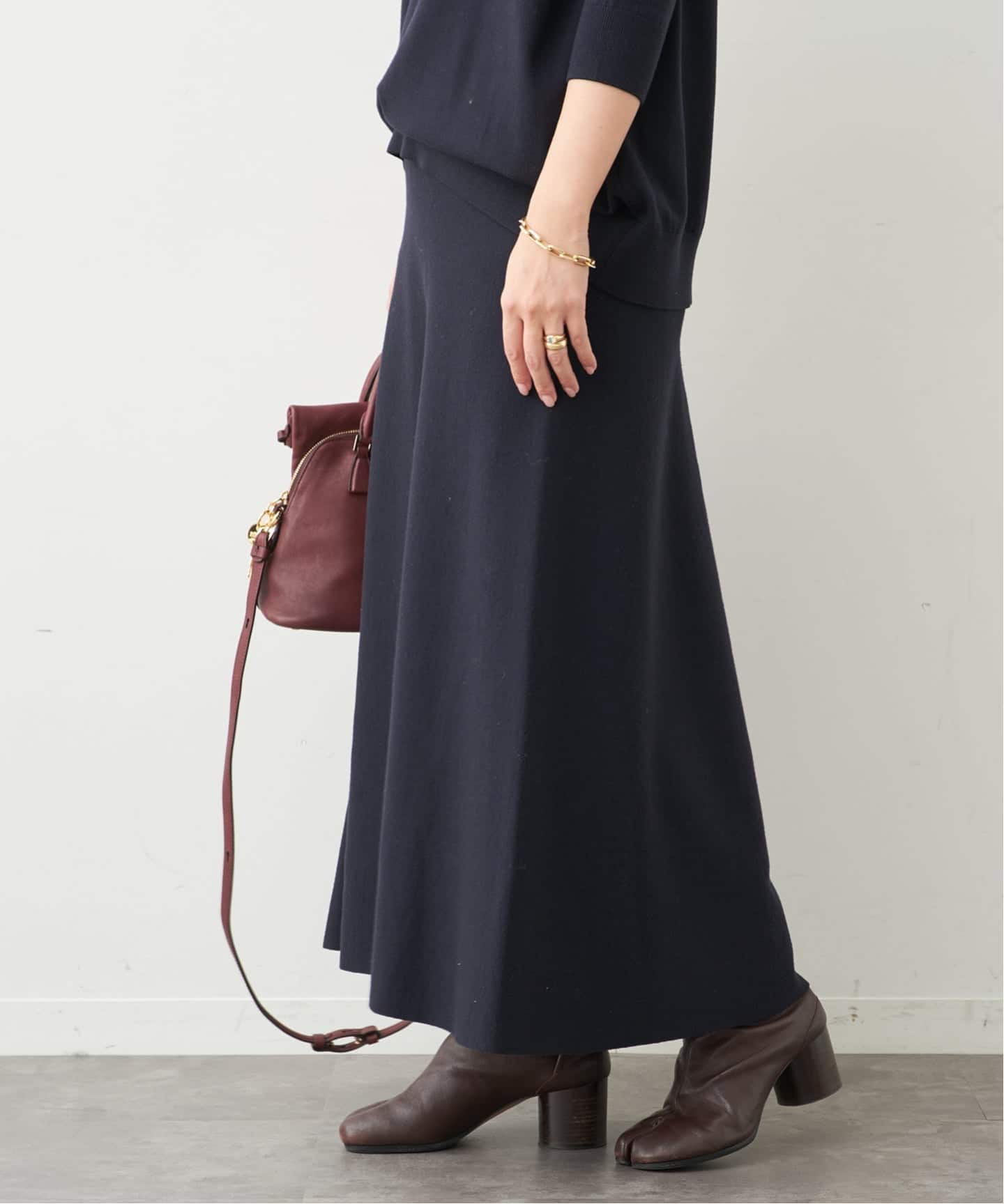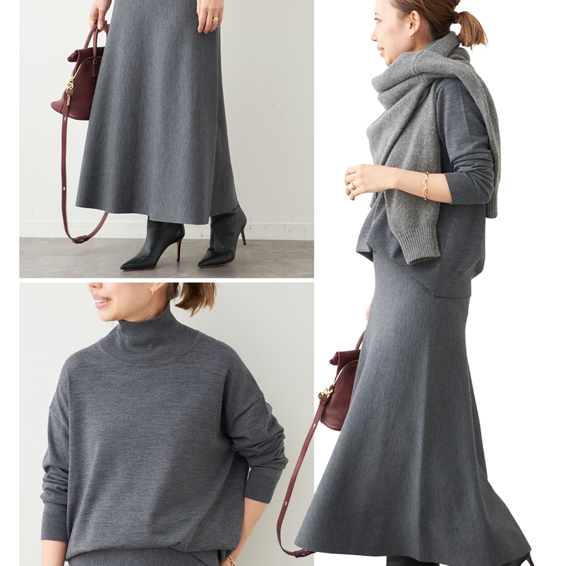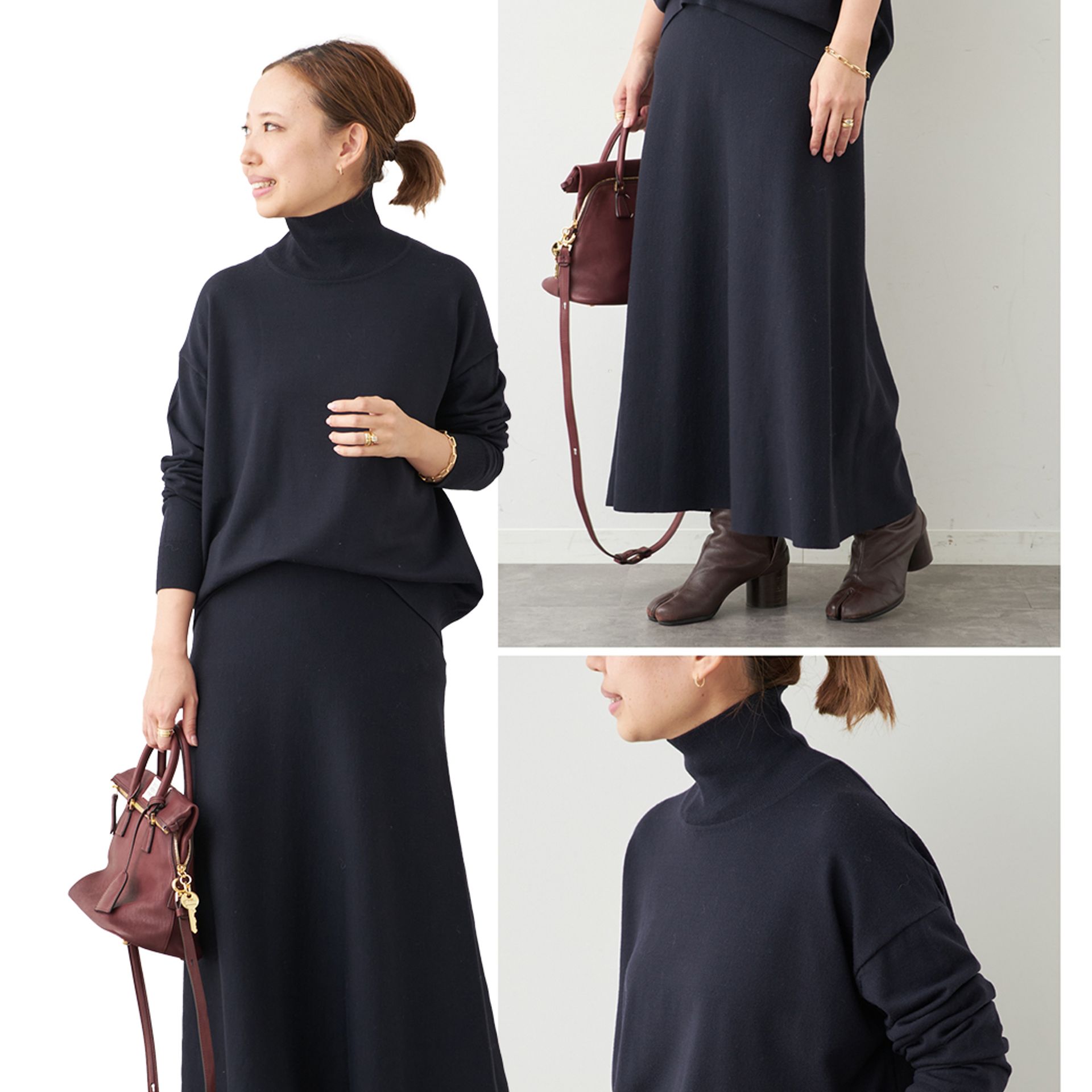 程よいゆとりのあるボディと、ぴたりと首に沿うネックが気品を醸し出しドラマティックなスカートとのニットアップスタイルはエレガントに決まる。