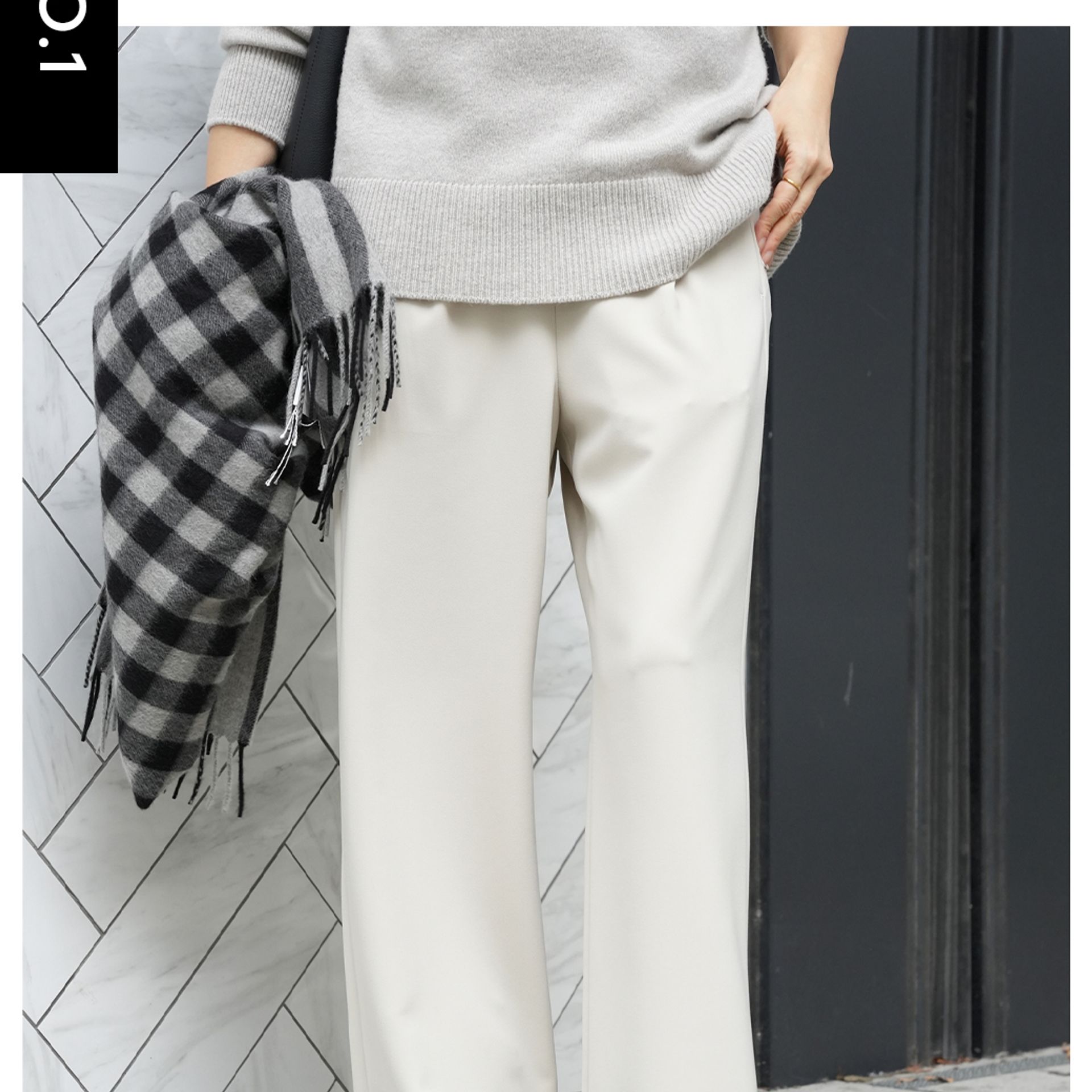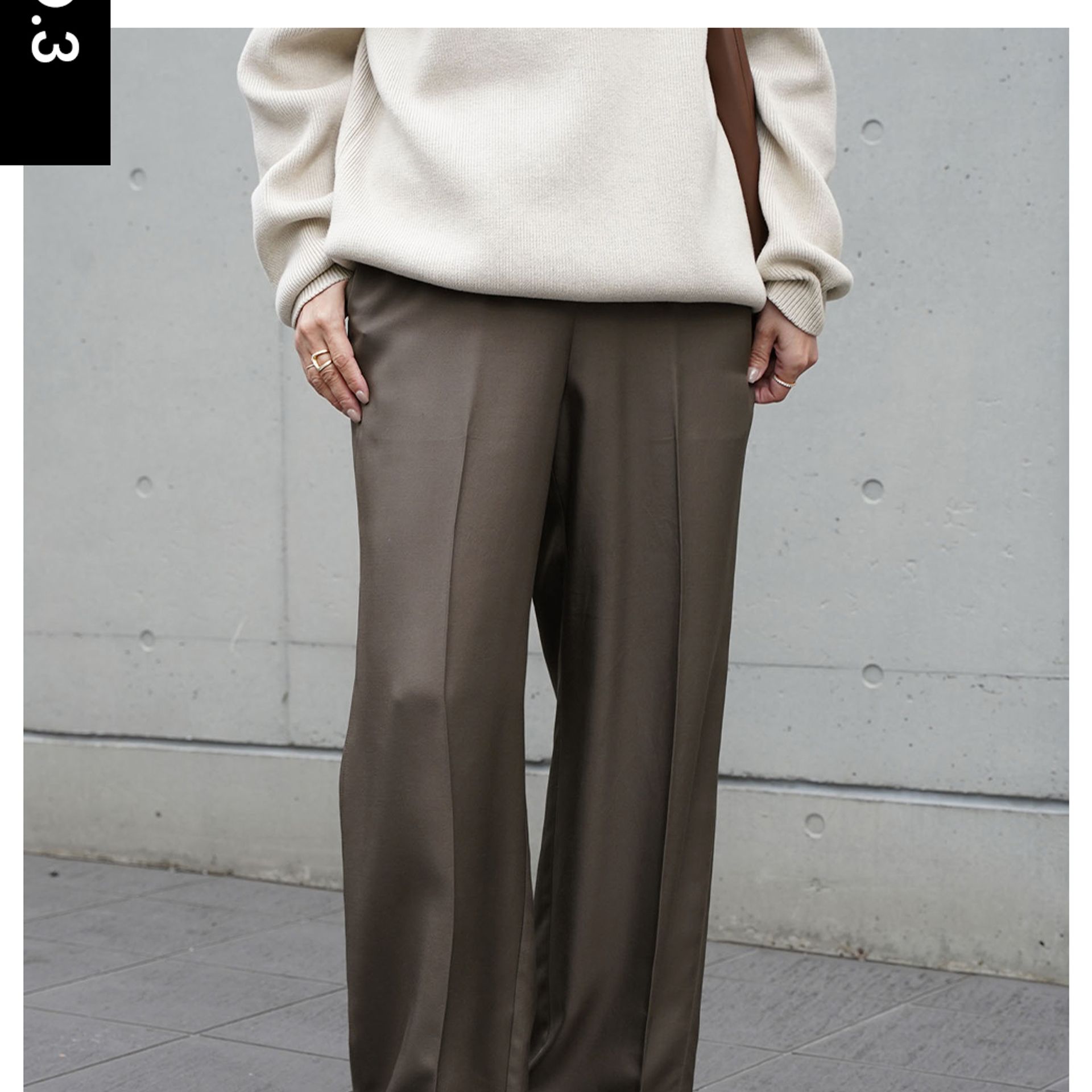 「身体のラインを拾わず縦にスルッと落ちて、でもテロテロせず、センタープレスできちんと感もあり、お尻大きめ下半身しっかりめ体型ですがそれが全然気になりません。後ろポケットの位置のおかげか透けもそんなに気になりません。適度なツヤが何を合わせてもエレガント。これはほかの素材では出せないなーと、価格にも思わず納得させられてしまう、優雅な雰囲気をまとえます。」