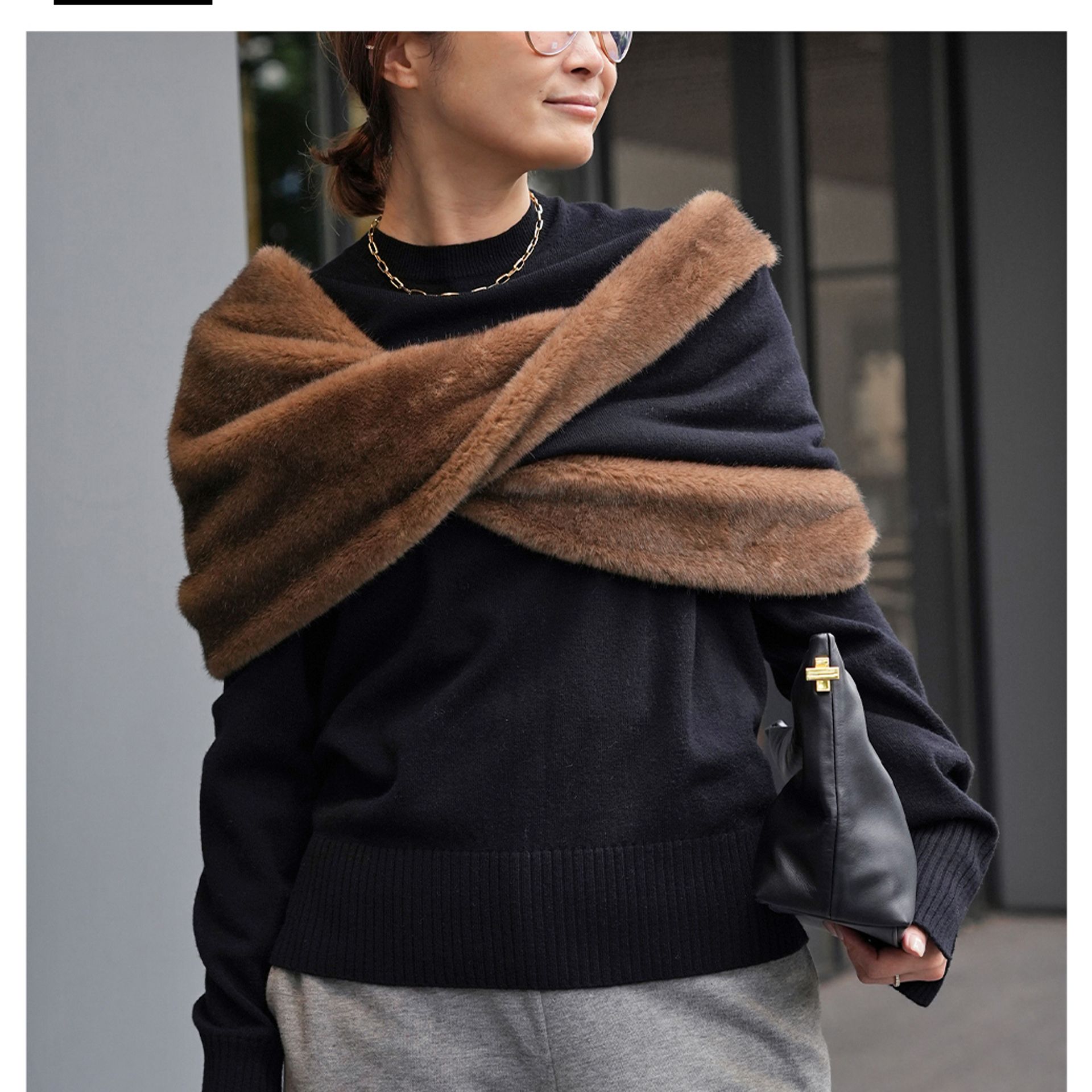 ファースヌードはねじってモダンに見せても肩を覆うようにも、自在に表情を変えられる。