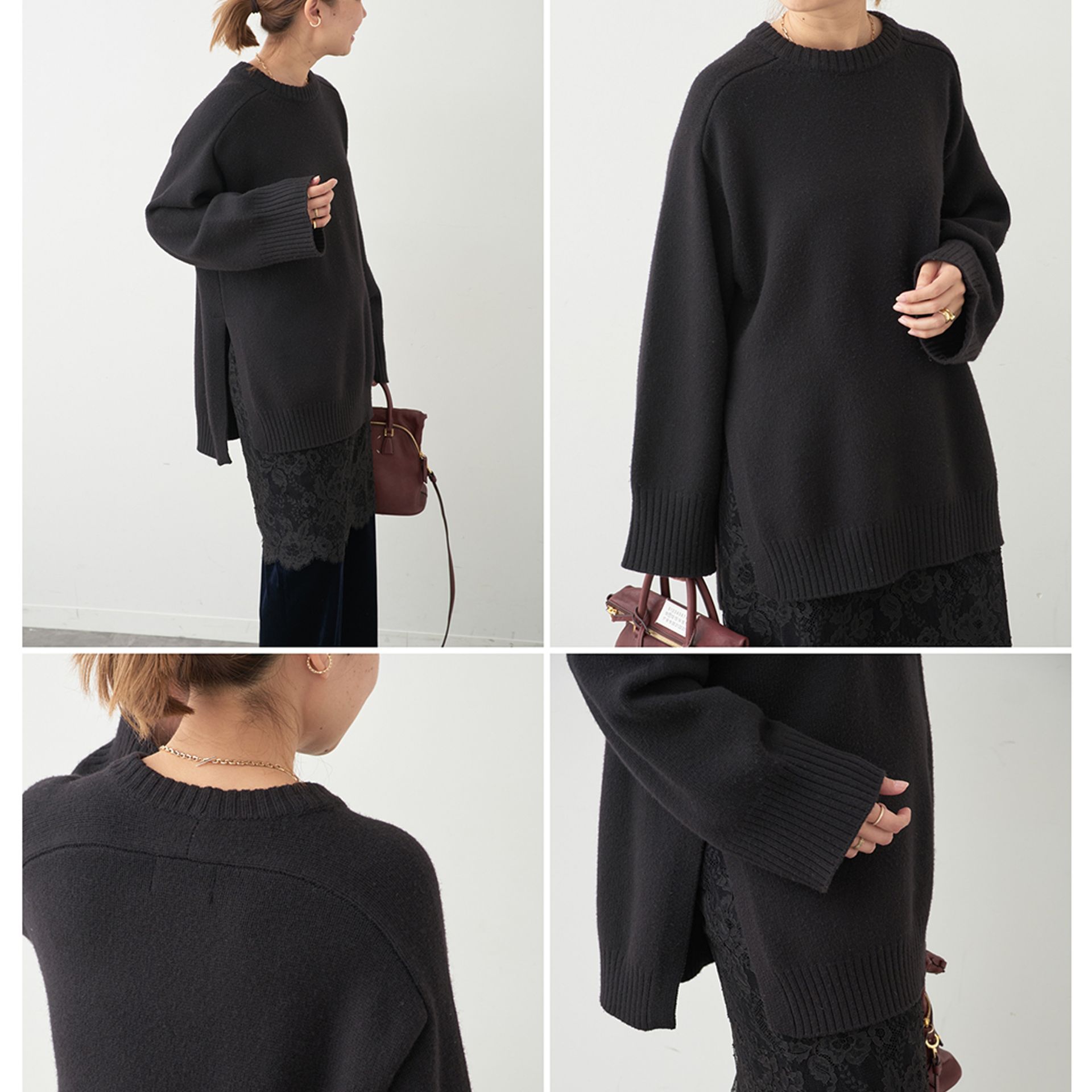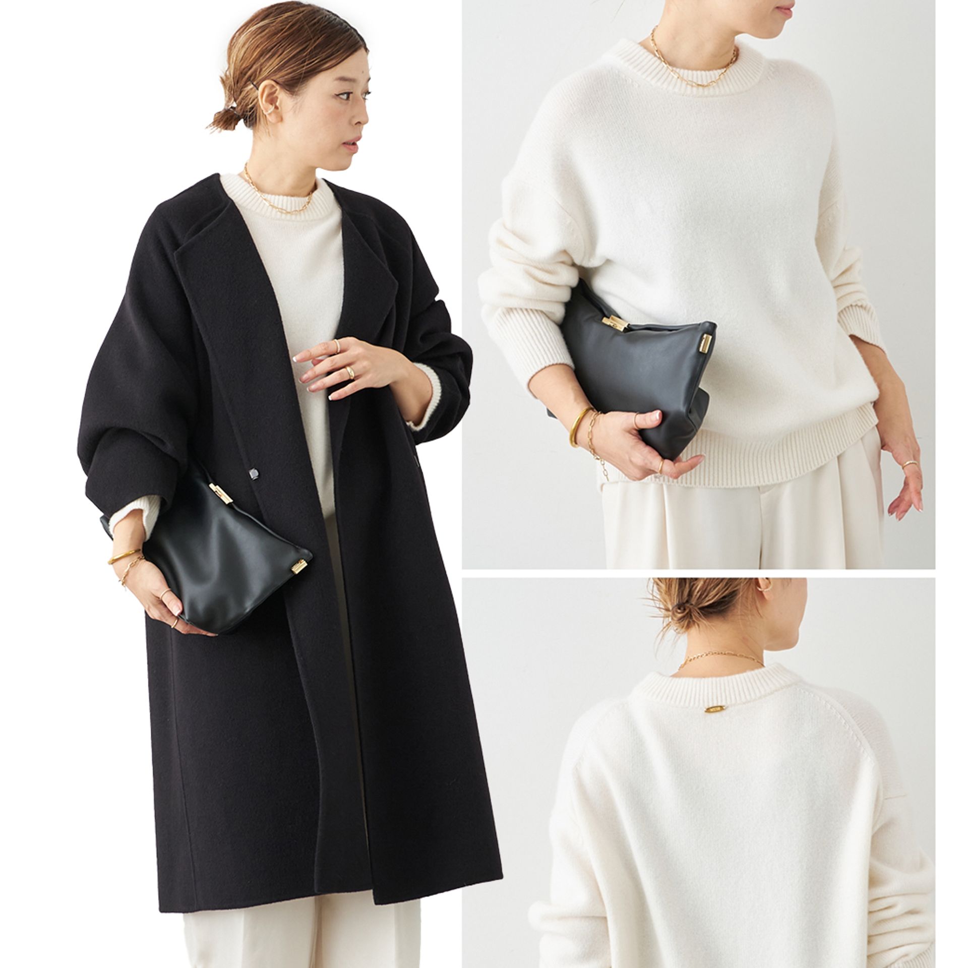 詰まったクルーネックに緩さのあるサイズ感が柔らかなモダンスタイルを演出しオーバーな袖丈は仕草までもフェミニンに見せる。
