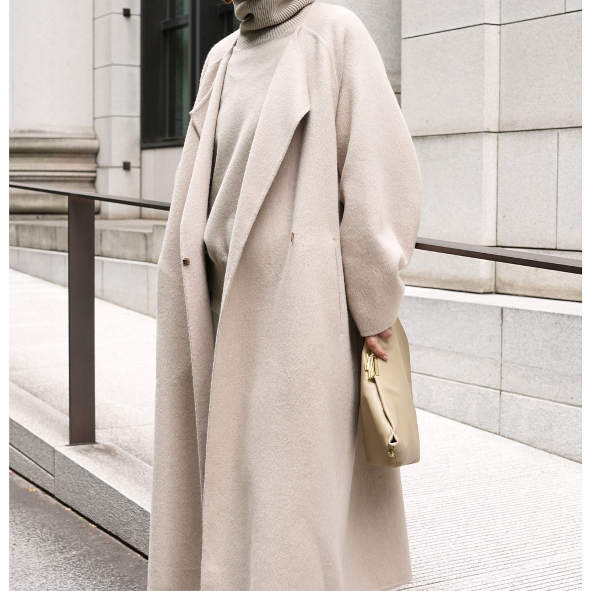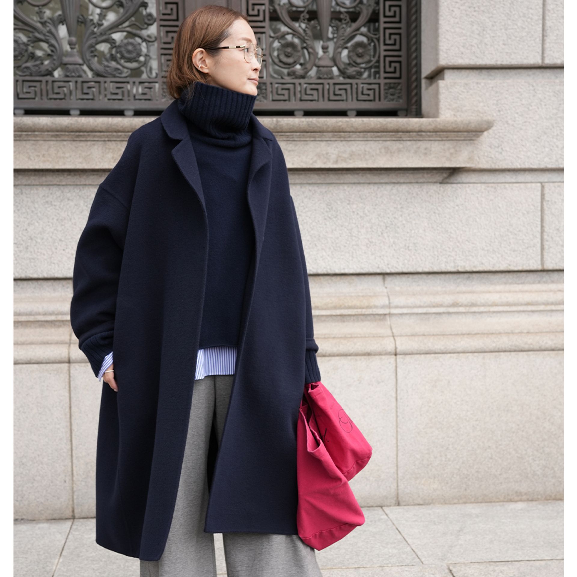 完成された大きめの襟は顔周りにニュアンスを出してくれ、ガウンのようにばさっと羽織っただけで様になる。ショート丈になったことで、エレガントなスタイルはもちろん、カジュアルなスタイルも楽しめる。