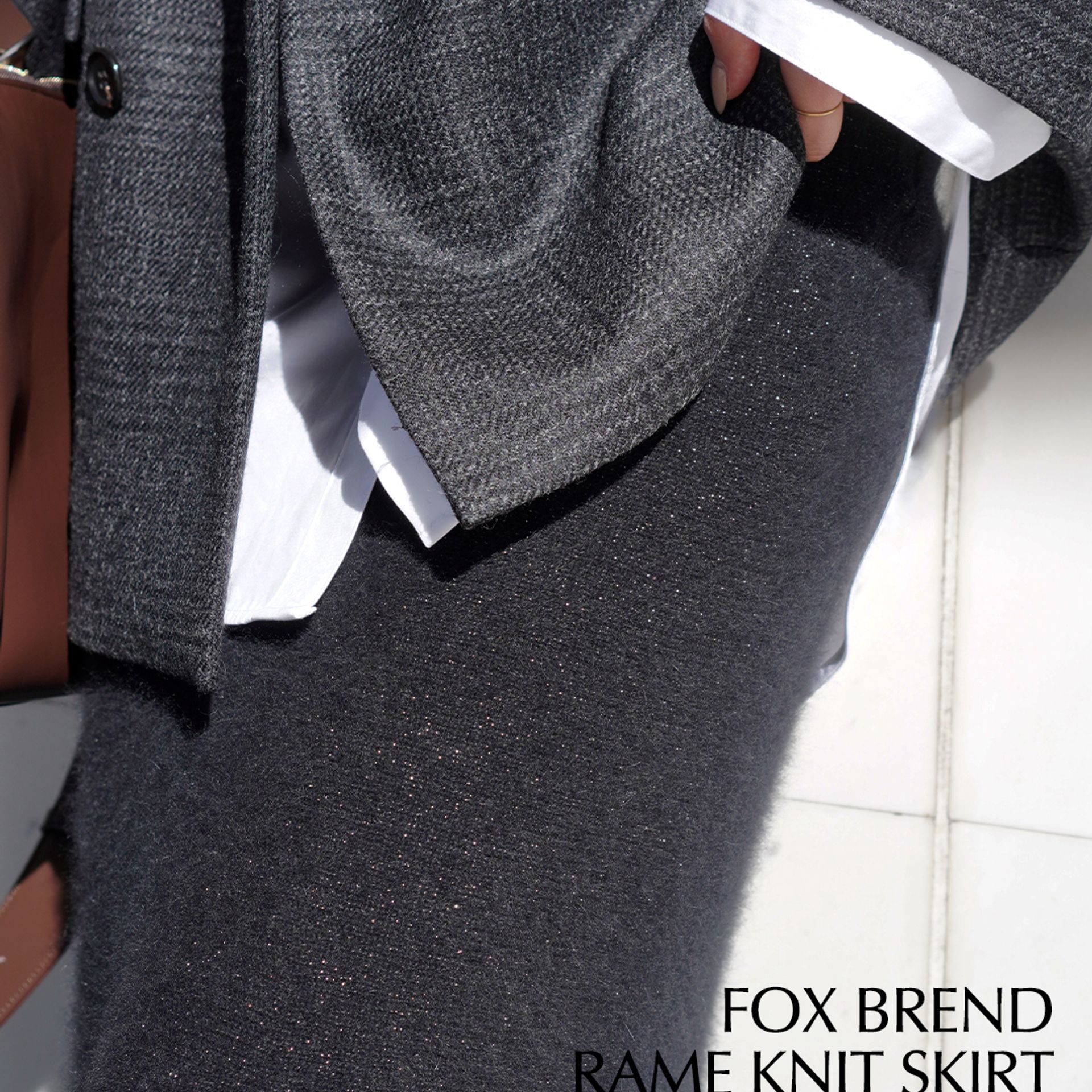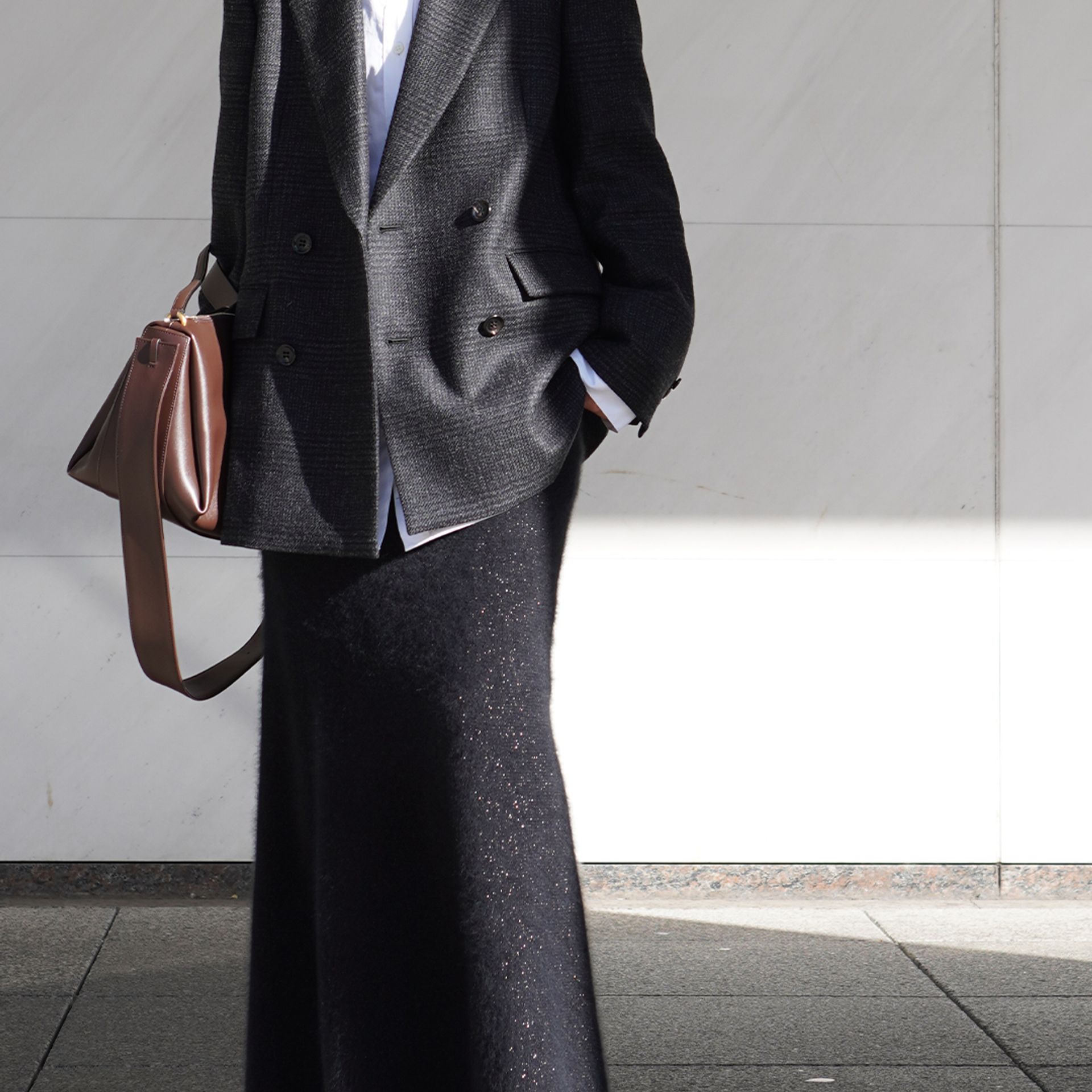 ラメ入りのニットスカートなら、保温性もありながらシャレ感がある。