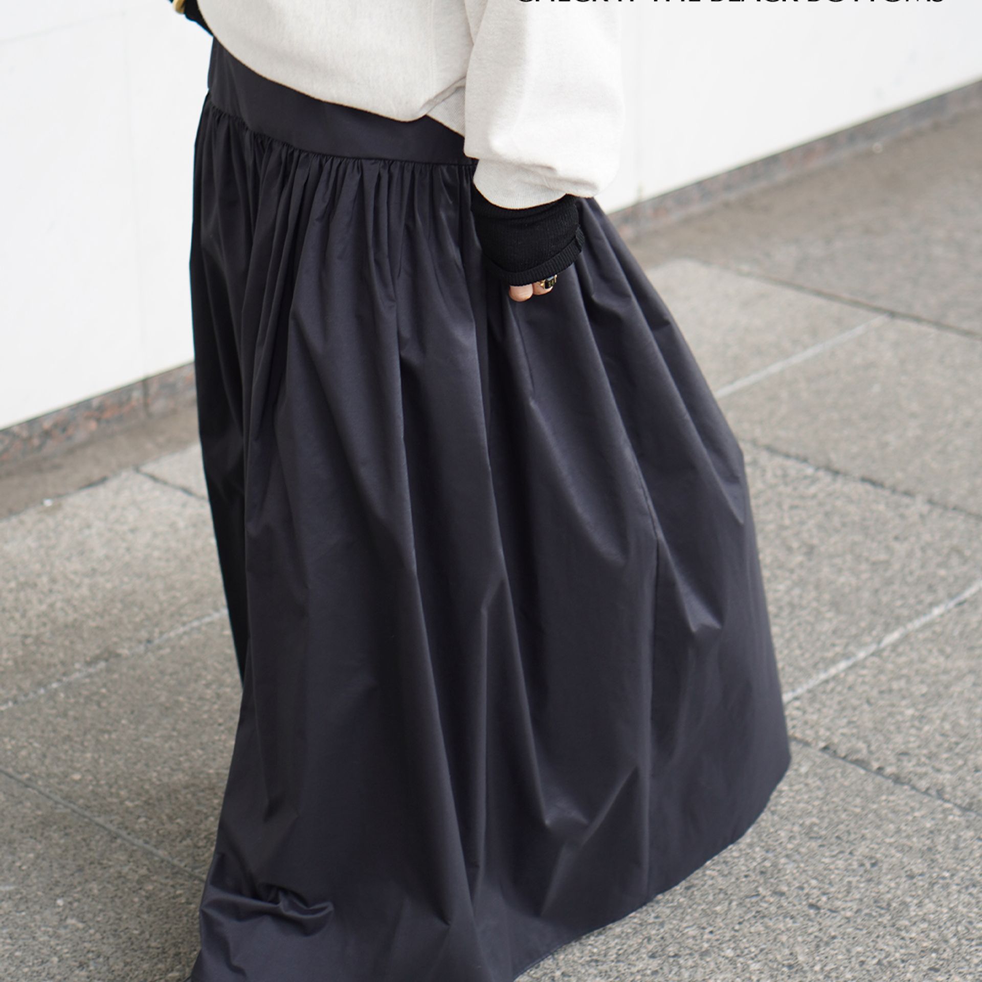 カジュアルなトップスもドラマティックに着られるタフタ素材のギャザースカート。