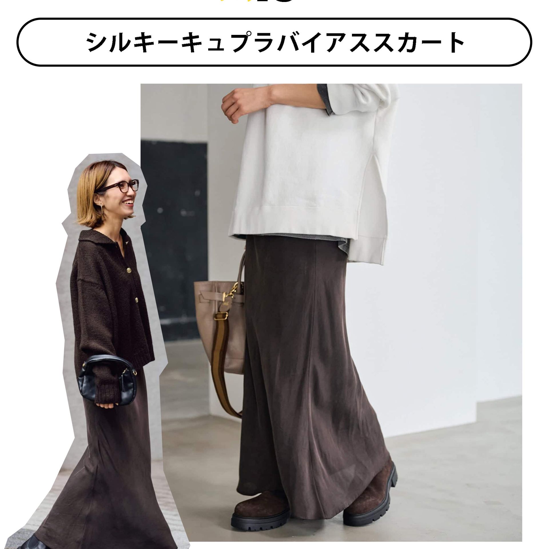 軽やかな抜け感を演出するサテンスカート。