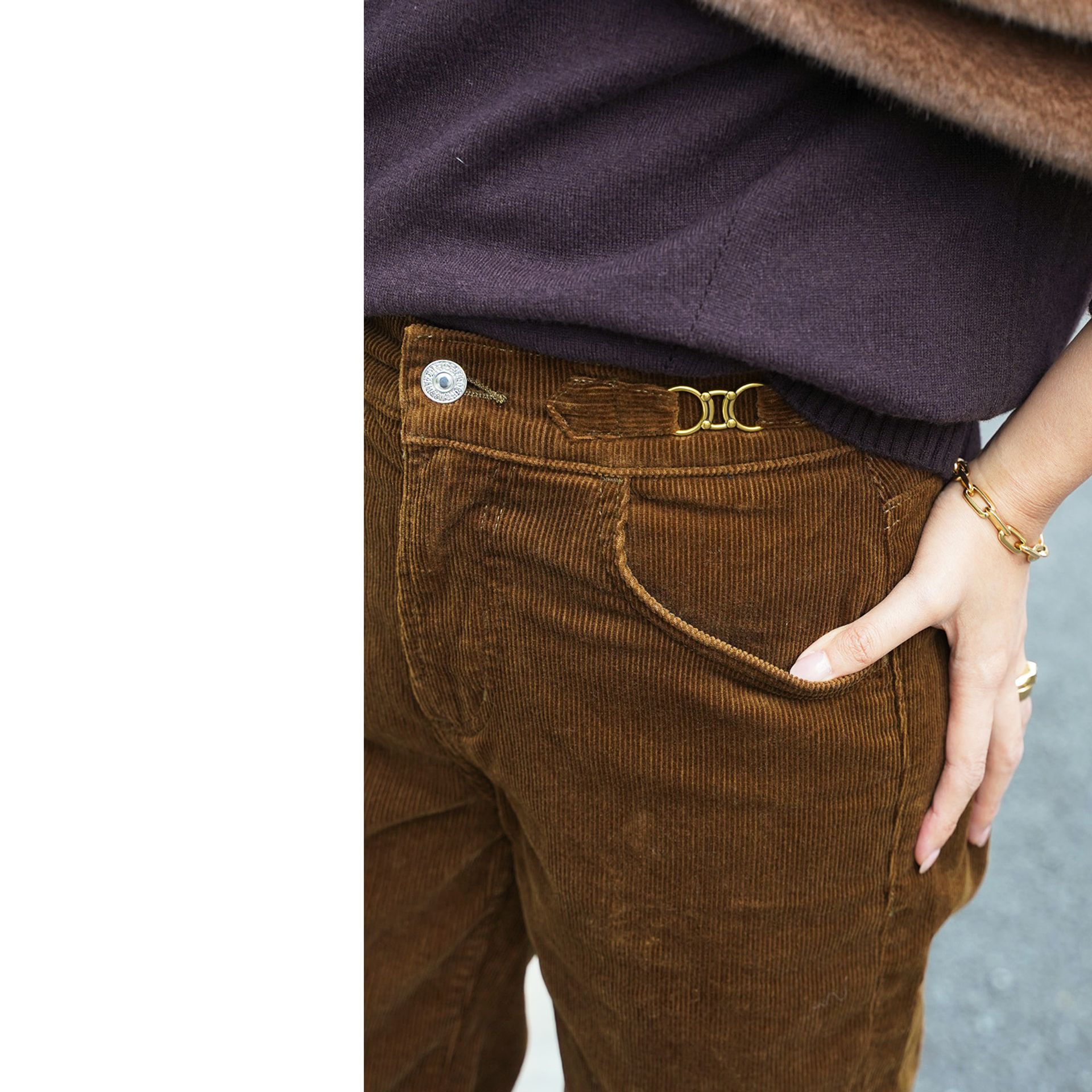 シックなキャメルとウエストにあるホースビットもアクセントに、70Sムード感じるまさに気分のボトムス。