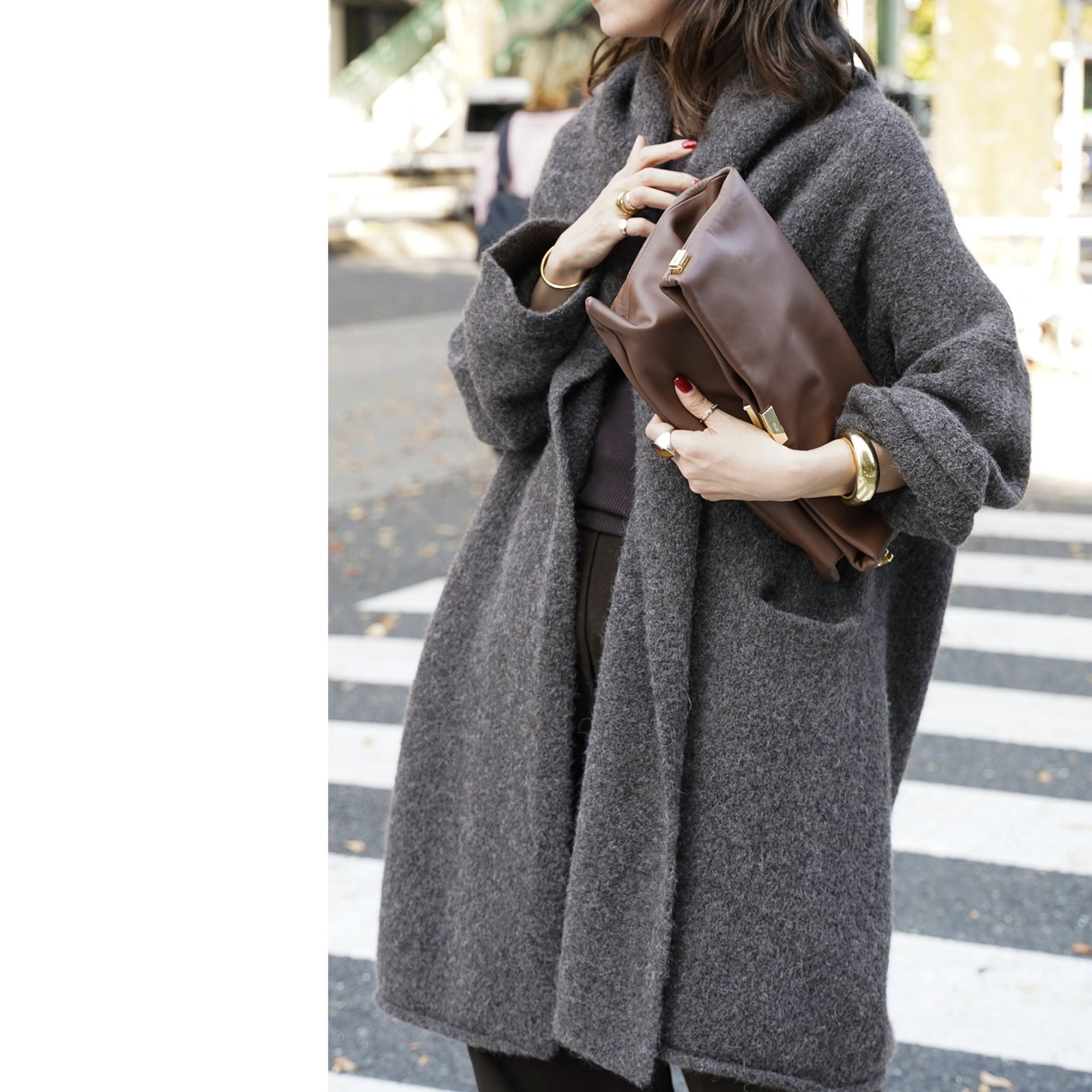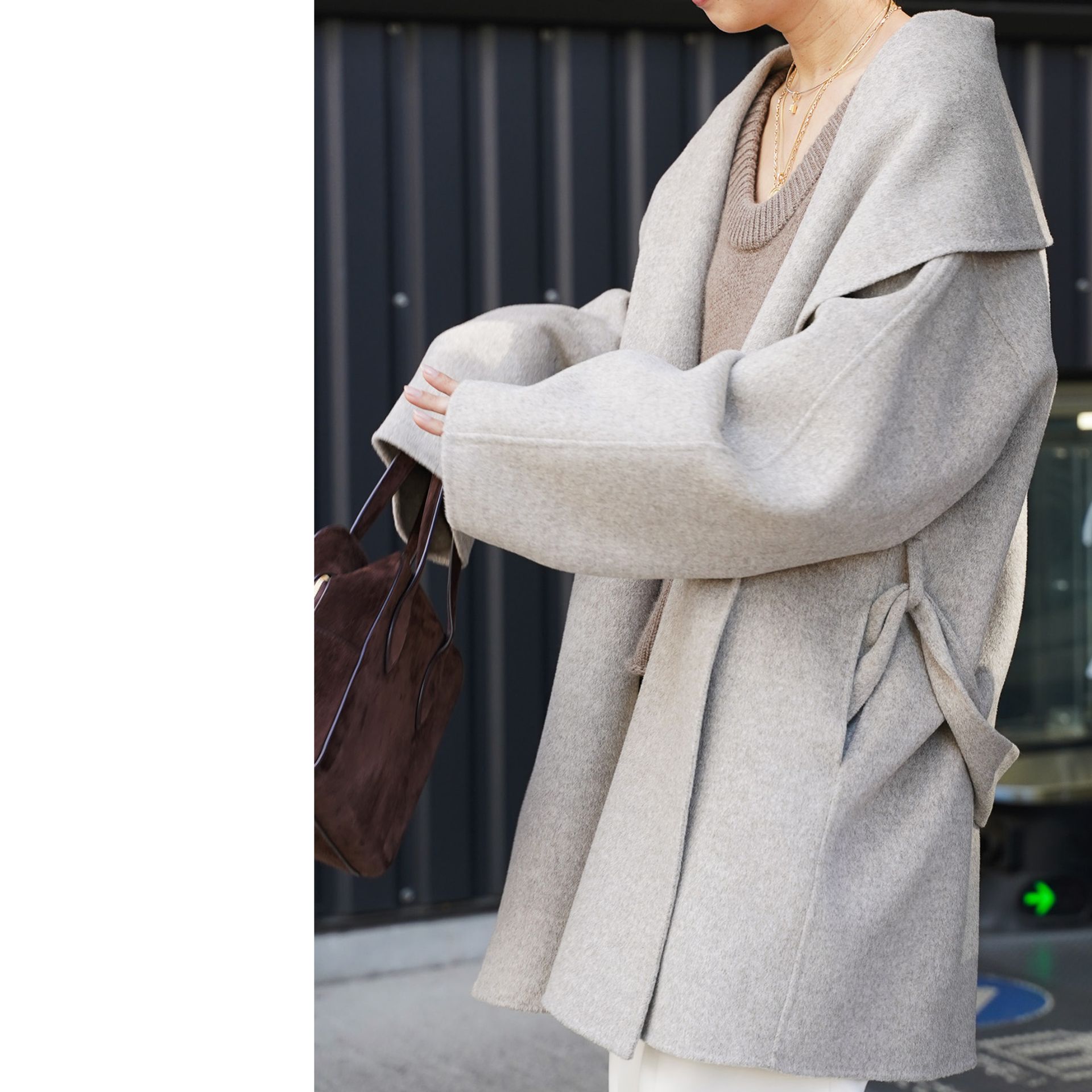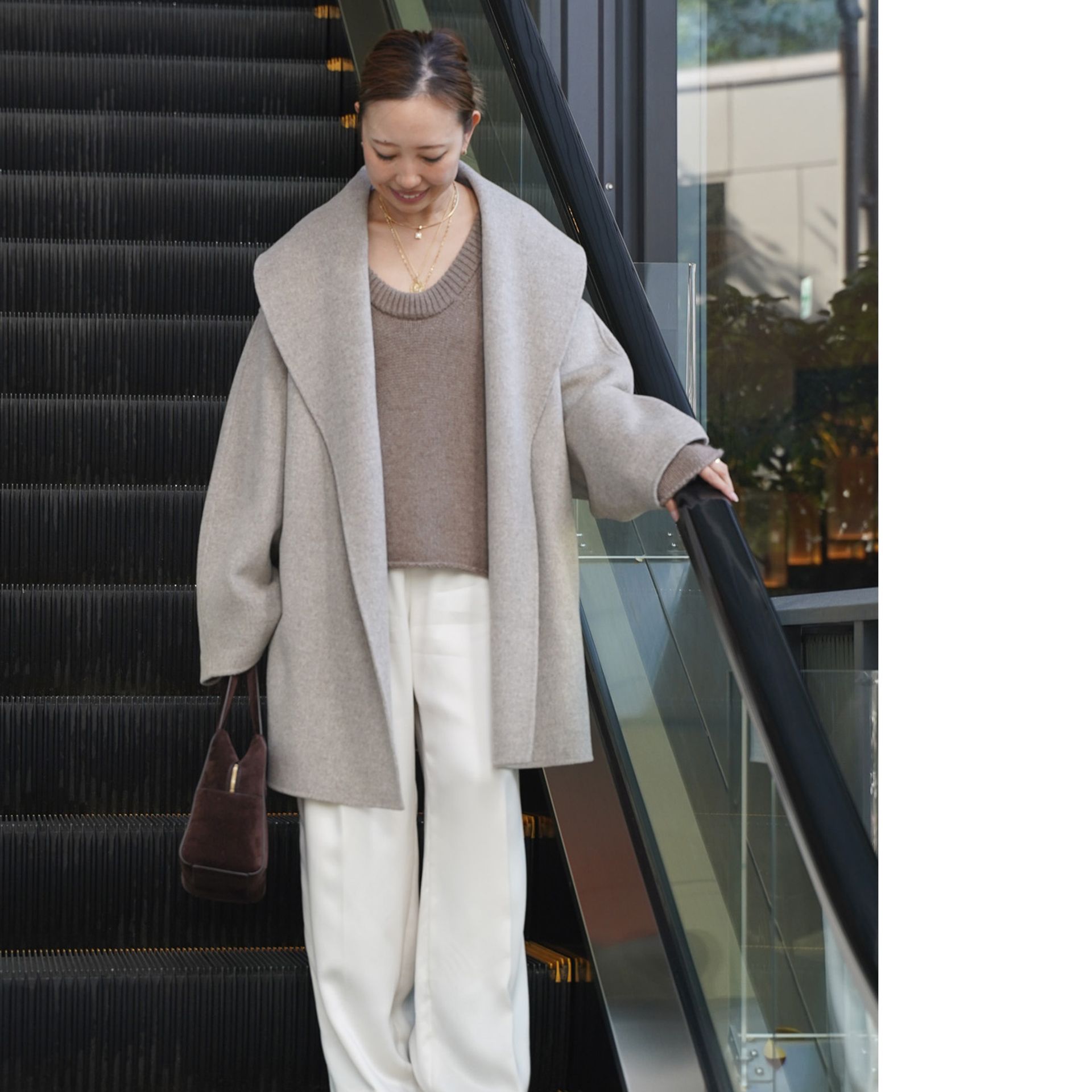 大きめの襟は顔周りにニュアンスを出してくれ、ガウンのようにばさっと羽織っただけで様になるアウター。