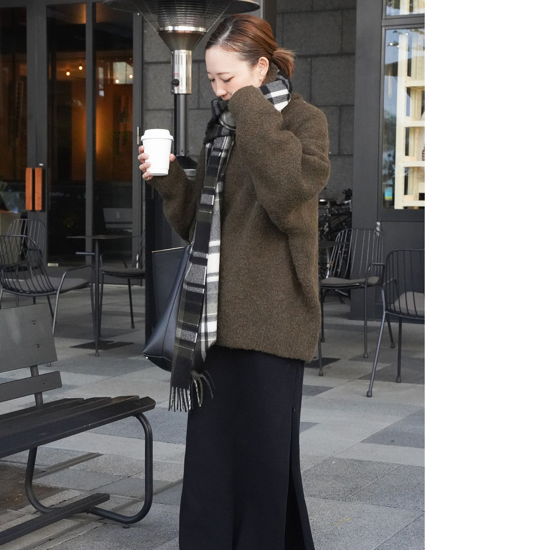 少し長めの着丈なので、敢えてロング丈のスカートを合わせて重みのあるIラインに。