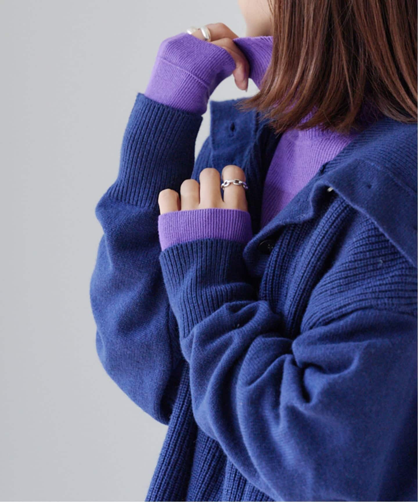 上まで釦を止めればルーズなタートルネックにも、