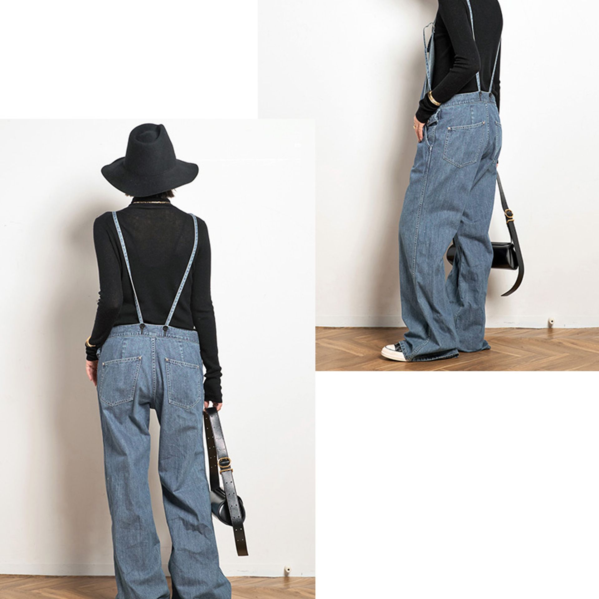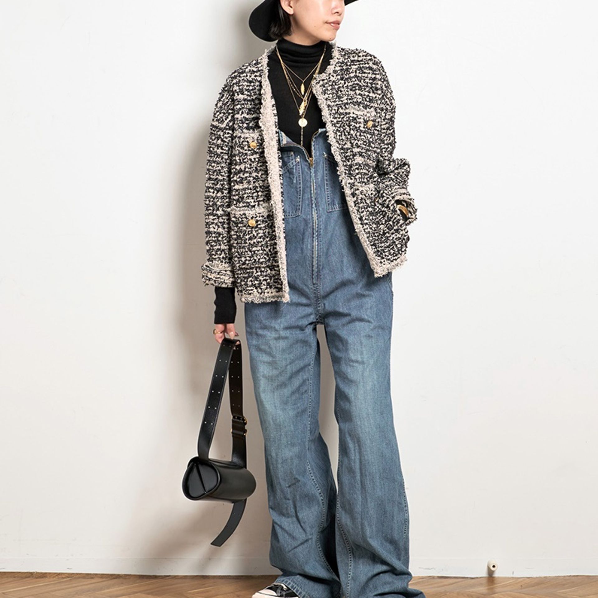 華奢なストラップと緩めのフレアシルエットが綺麗な”JOHNBULL”のフレンチサロペット。