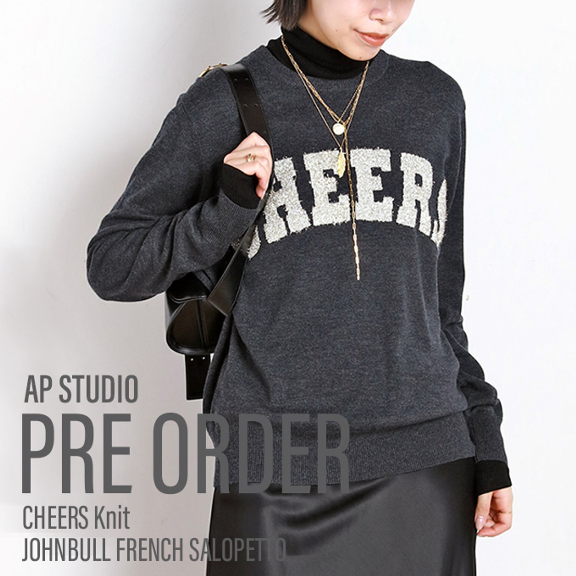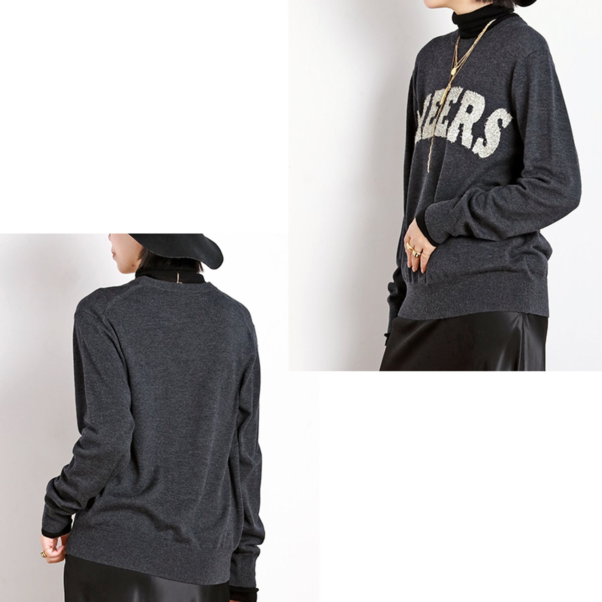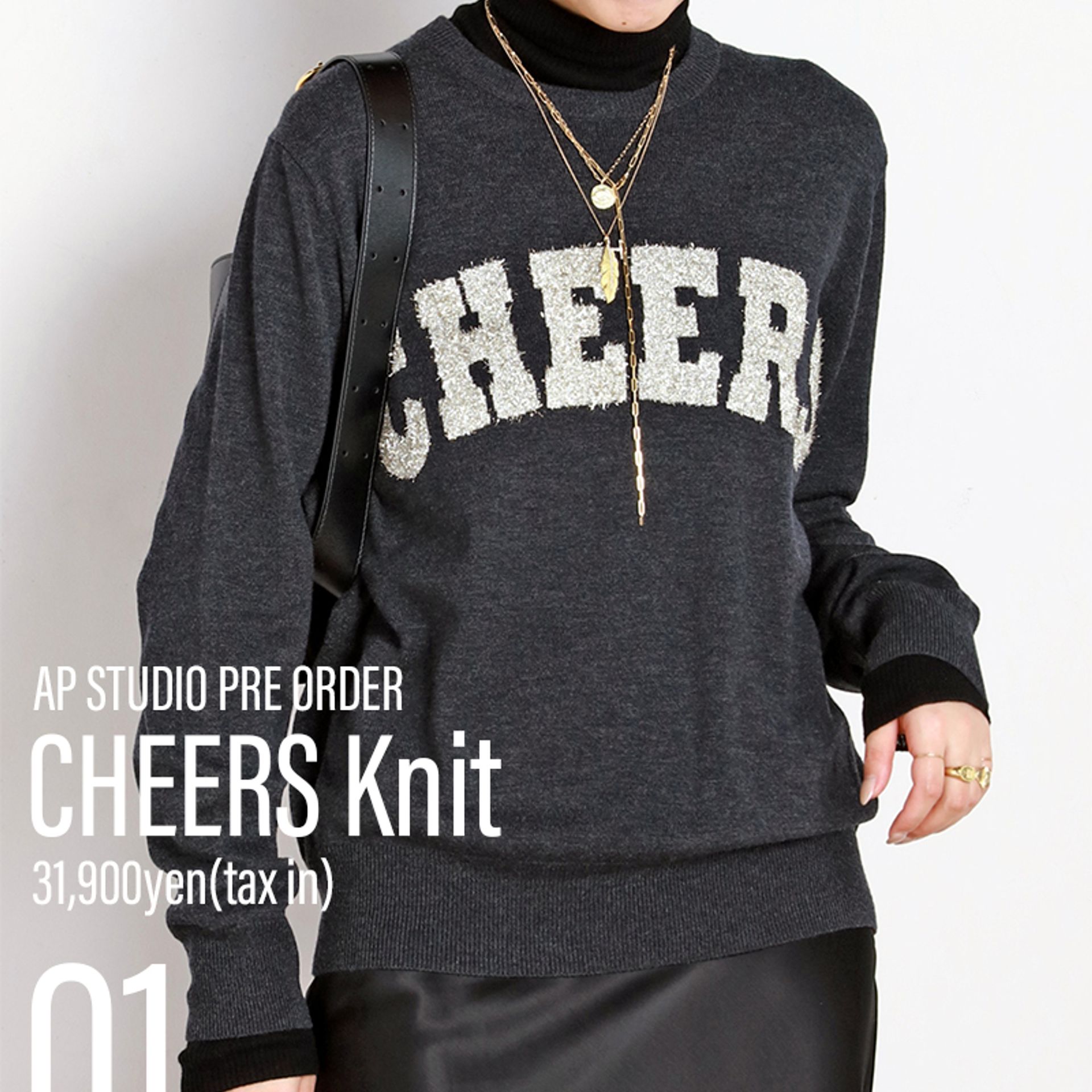 スリット糸の「CHEERS」ロゴが華やかなニット。