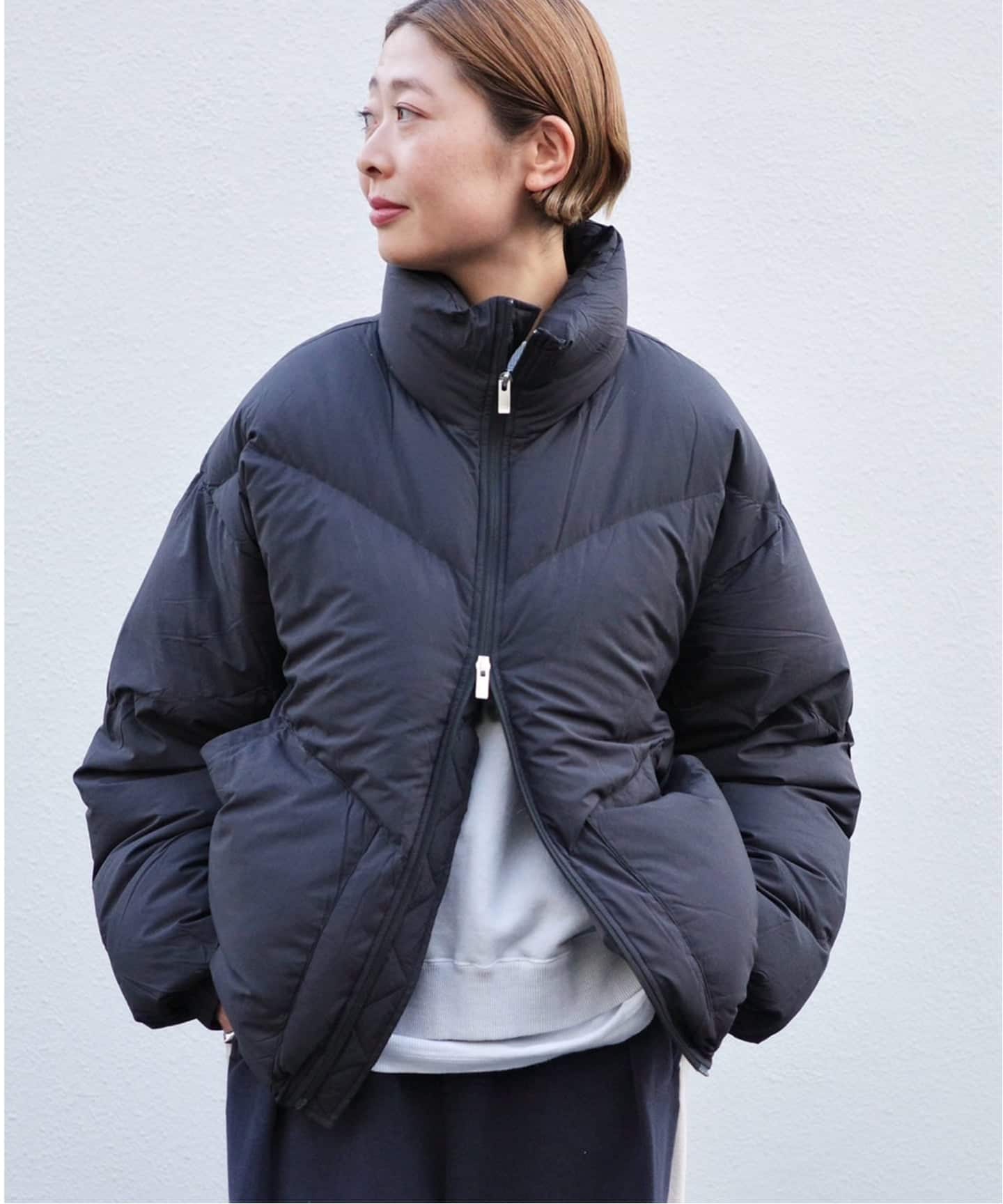 ワイドスクエアシルエットのダウンジャケット。ボリューム感のあるスタンドカラーで、首元まで暖かく包み込んでくれます。
