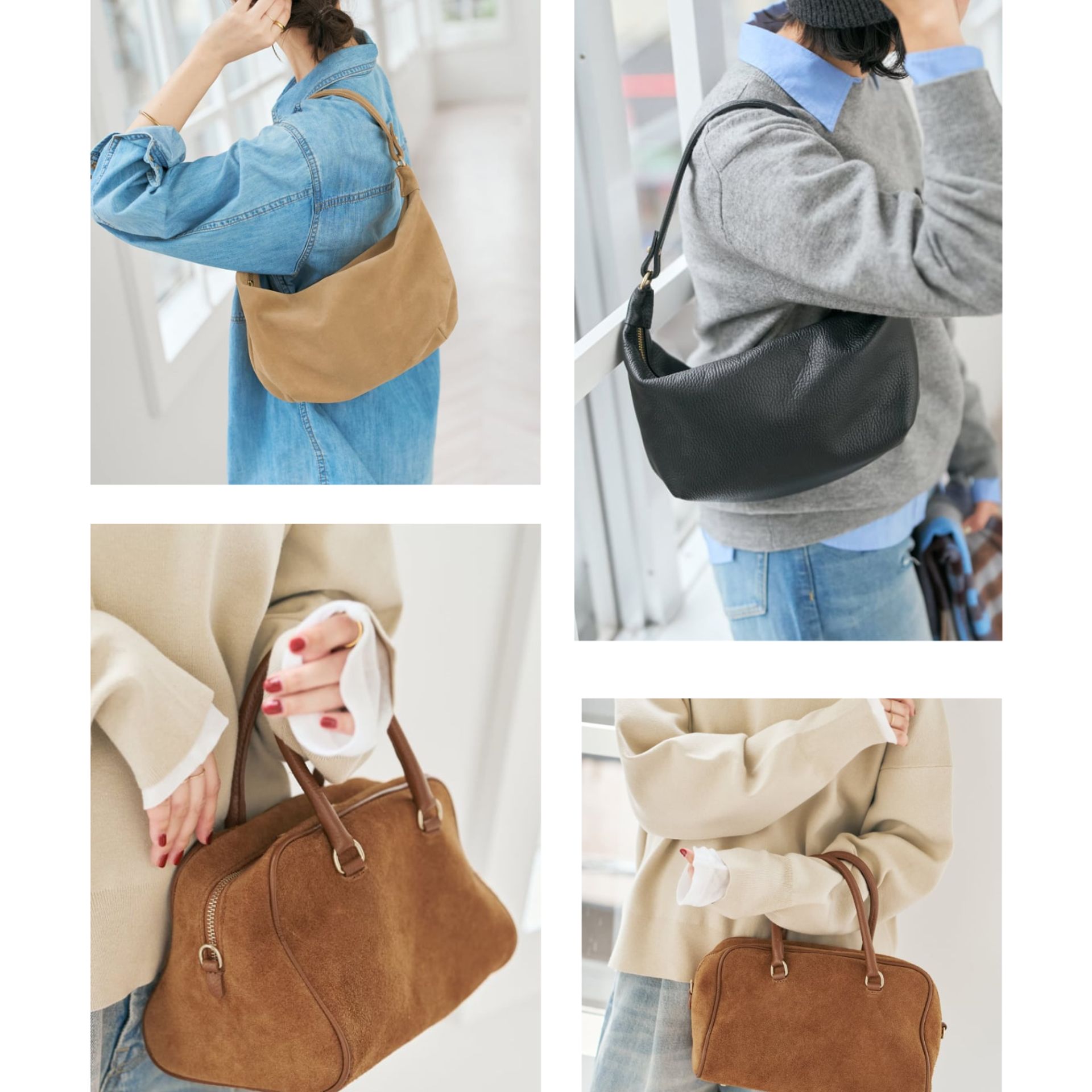 SS別注のフェイクスエードトートは、Mサイズはしっかり収納でき、Sサイズはコンパクトで日常使いに最適です。